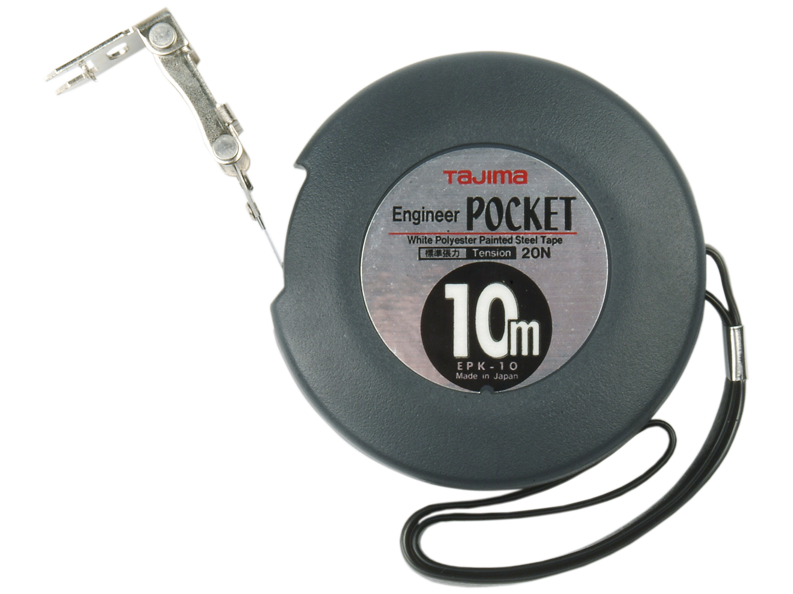 Tajima Pocket båndmål på 10 mtr med 10 mm bånd. I cirkelrund kapsel som er meget kompakt med sammenklappelig greb for hurtig oprulning. Monteret med strop. Hvidt bånd med nulpunkt ved hagekrogens yderkant. Godkendt efter JIS1.