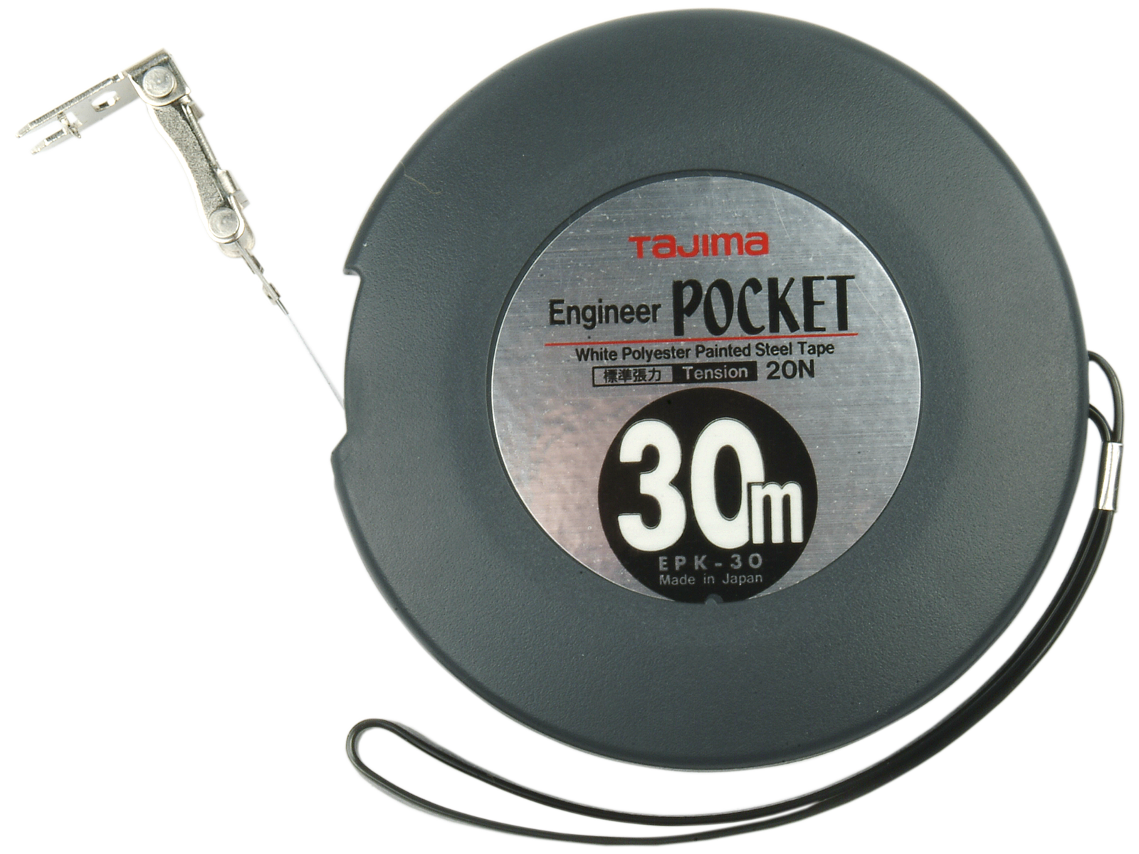 Tajima Pocket båndmål på 30 mtr med 10 mm bånd. I cirkelrund kapsel som er meget kompakt med sammenklappelig greb for hurtig oprulning. Monteret med strop. Hvidt bånd med nulpunkt ved hagekrogens yderkant. Godkendt efter JIS1.