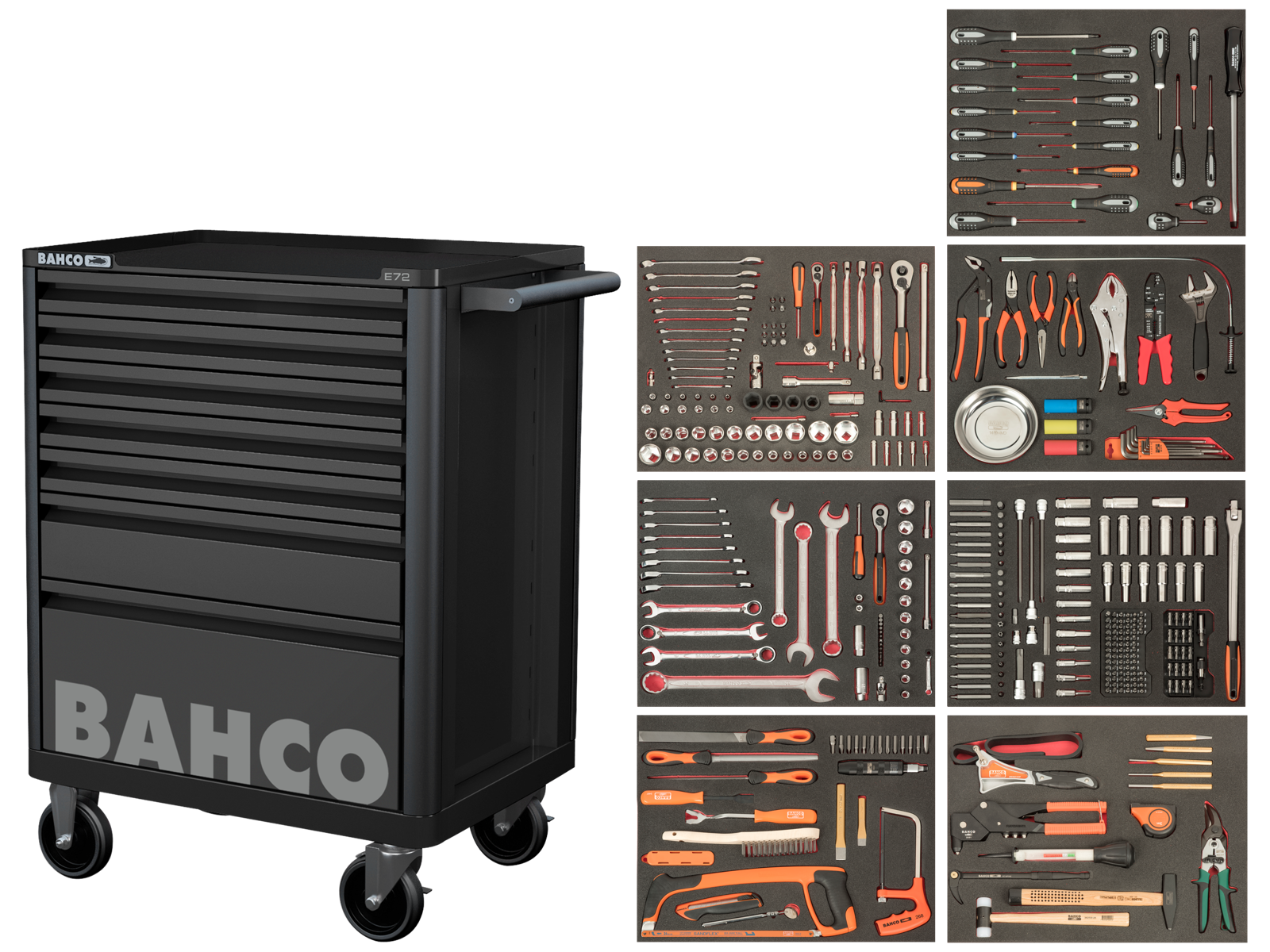 Værktøjsvogn E72 Storage HUB med 416 værktøjsdele fordelt i 7 skuffer. Indhold: FF1A153 med 1/2" og 1/4" topnøglesæt - FF1A164 ringskraldenøgler 8-19 mm, ringgaffelnøgler 21-32 mm og 3/8" topnøglesæt - FF1A165 med div. bits og lange toppe - FF1A166 med skruetrækkere i et hav af størrelser og typer - FF1A167 med tænger, slagtoppe og stiftnøgler m.m - FF1A168 og FF1A169 med blandet tilbehør. Vognen er fremstillet i en solid stålkonstruktion med dobbelt ramme. Skufferne kan åbnes helt og er udstyret med kuglelejer, så de løber glat, og har en kapacitet på op til 30 kg. Gummihjulene sikrer maksimal stabilitet og gør vognen nem at manøvrere, selv på ujævne gulve. De perforerede sidepaneler gør det muligt for brugeren at tilføje forskelligt Xpand-tilbehør. Et stærkt og sikkert rundt låsesystem beskytter vognen mod tyveri. Ridsefri pulverlakering udvendigt og indvendigt yder storåbeskyttelse mod rustdannelse. Stødlister på hjørnerne minimerer risikoen for fysisk skade og beskadigelse af omgi