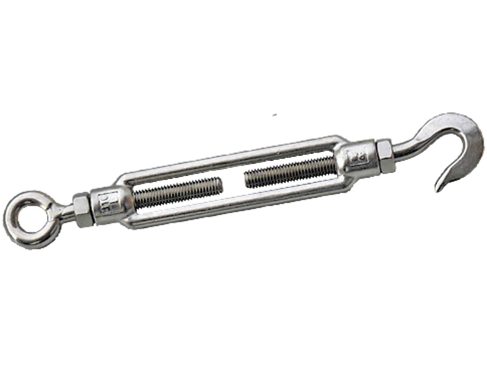 Syrefast, AISI 316 bardunstrammer med øje og krog til stramning af stålwirer. Velegnet til maritimt brug og i korrosive miljøer. I henhold til DIN 1480.