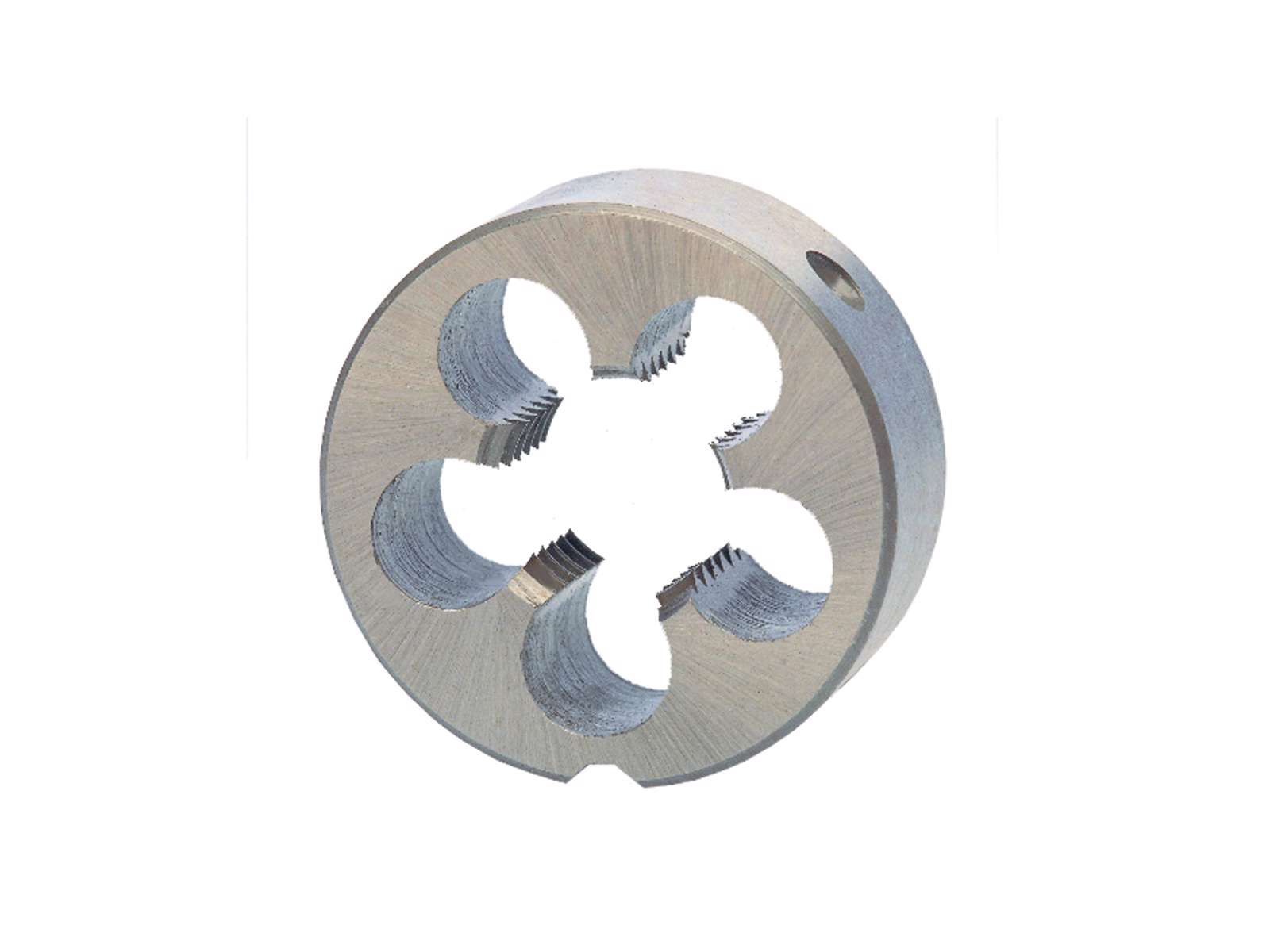Rund gevindbakke af kraftigt højhastighedsstål (HSS). Til ulegeret og lavlegeret stål op til en styrke på 800 N/mm². Gevindet skæres i én arbejdsgang. Venstregående, 60°. Fås i flere dimensioner.
