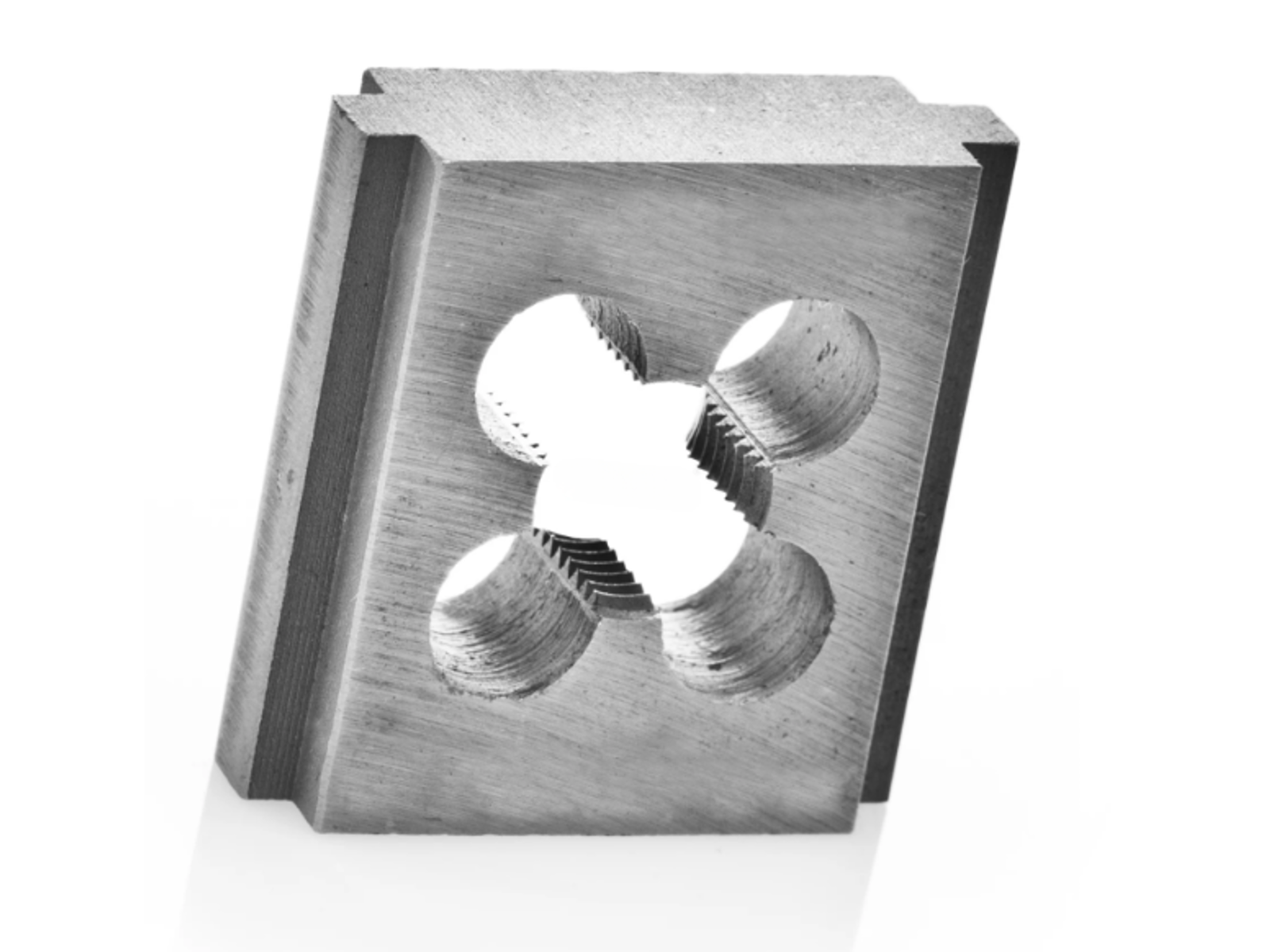 • Firkantbakke til skæring af udvendigt gevind. Det er en stor fordel, at samme klup bruges indenfor et stort gevindområde (No1. M3-16 og No3 M18-M24). Modsat runde bakker, findes der kun to klup størrelser. I den firkantede klup er et styr for emnet, så man er sikker på, at på at have den rigtige placering, samt hurtig montering. Firkantbakken kan skære i stål/jernmateriale op til en hårdhed på 800N/mm², samt rustfrit stål.