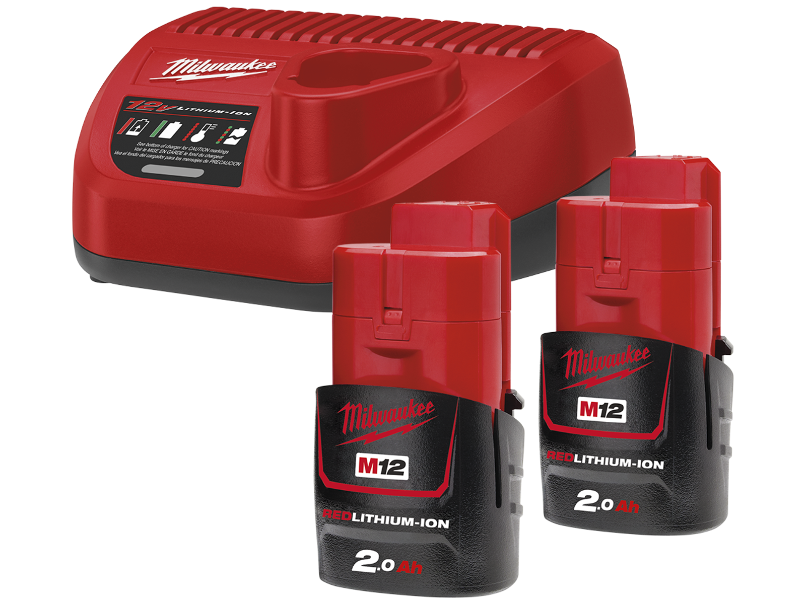 Batteripakke med 2 stk. 12 V 2,0 Ah li-ion batterier, samt lader med elektronisk temperaturbeskyttelse, som optimerer ladeeffekten under ekstreme temperaturer og forlænger batteriets levetid. Lader beskyttet mod støv, fugt og slag. LED-lys indikerer batteriets ladestatus. Ladetid 40 min.