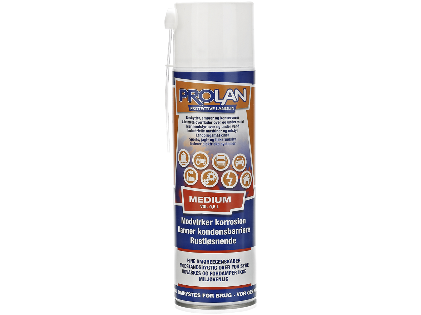 Prolan Medium er det perfekte middel til mindre smørings- og anti-korrosionsopgaver da det penetrerer ind i rust, samlinger og kroge. Benyttes som bl.a. rustbeskyttelse på ATV-chassis o.l. samt som universal-værkstedssmøremiddel og til beskyttelse af reservedele, elektriske samlinger, korrosionsbeskyttelse og smøring på både, motorer og trailere. Produktet er elektrisk adskillende op til 70 kV, biologisk nedbrydelig og modstår syrer og salte. Udvaskes og fordamper ikke. Lukker overflader hermetisk for ilt. Tåler afvaskning med højtryksrenser. Sikker at anvende på syntetiske materialer, gummi og elektriske systemer. Internationalt Fødevaregodkendt til klasse H1,H2 og R2. Indeholder lanolin, blandet med ikke regulerede paraffiner for at lette påføring. Produktet kan fjernes igen med Porlan Cleaner eller lugtfri olie. Fås i flere varianter.