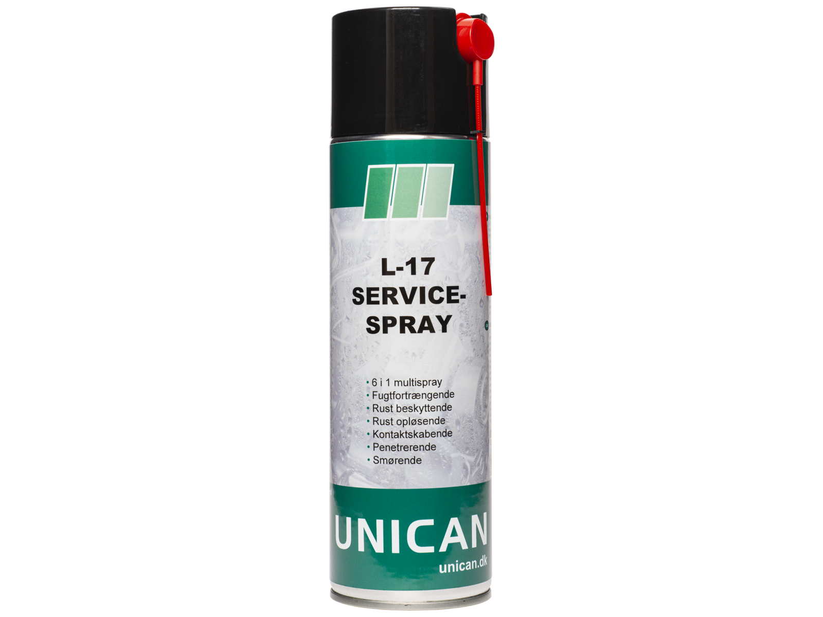 L-17 Servicespray er et produkt med mange brugbare egenskaber. Ved driftsstop, der skyldes vand eller fugt i elektriske komponenter, sprayes L-17 Servicespray direkte på de problemskabende komponenter. Produktet fortrænger fugt og skaber ny kontakt så arbejdet kan forsætte. Samtidig lægger der sig en meget tynd smørefilm, som beskytter mod korrosion og forebygger nye driftsstop. L-17 Servicespray har en særdeles god penetrerende og beskyttende evne, som gør den yderst effektiv til kontaktskabende smøring på selv svært tilgængelige steder. Produktet kan også med succes anvendes som låse- og våbenolie. Produktet bruges yderst effektivt til afhjælpning af startproblemer i køretøjer, som oftest skyldes krybestrøm på grund af fugt i strømfordeleren. L-17 Servicespray kan anvendes indenfor et bredt temperaturområde fra –20° til 150° grader.