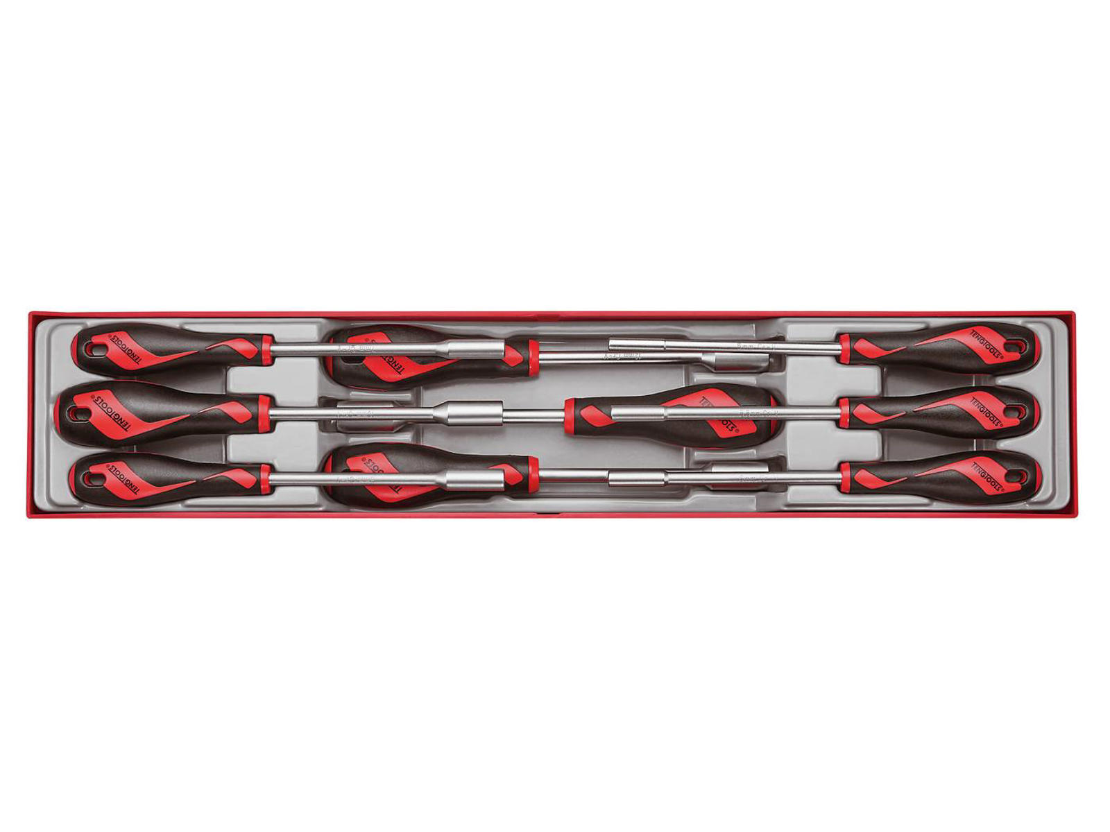 Sæt med 9 stk. topskruetrækkere med klinge af TT-MV-stål. Sekskantet åbning. Ergonomisk tokomponentsgreb med ophængningshul. Leveres i plastbakke, der passer i Teng Tools' værktøjskasser og værktøjsvogne.
