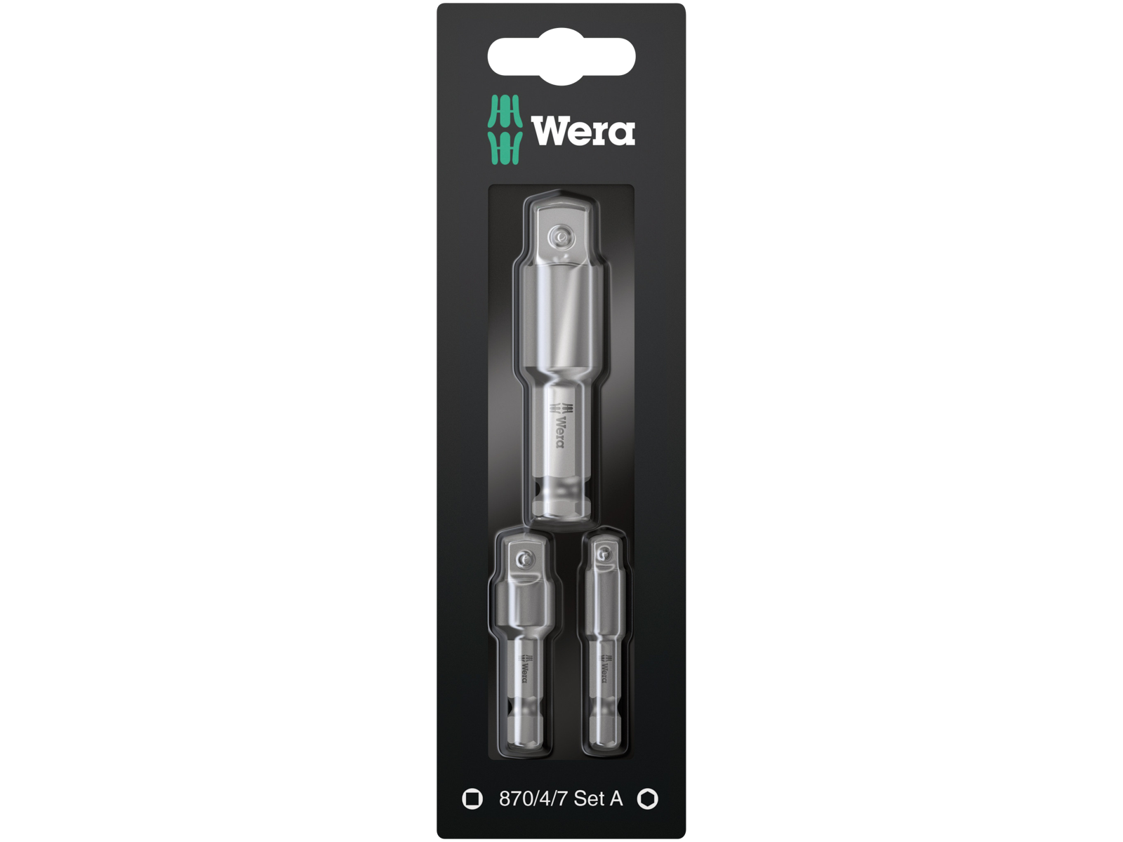 Tre værktøjsskafter til maskindrevne topnøgleindsatser. Med 1/4", 3/8" og 1/2" udv. 4kt-tilslutninger. 1/4" usv. 6kt- og 7/16" udv. 6kt-tilslutning.