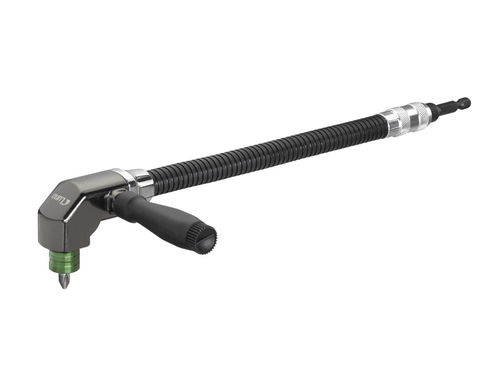 Vinkelborforsats med bøjelig aksel. Til skrue- og borearbejder på vanskeligt tilgængelige steder. Udstyret med støttegreb, som kan monteres på højre eller venstre side. Med 1/4'' fæste og et vinkelgear, der kan klare op til 20 Nm.