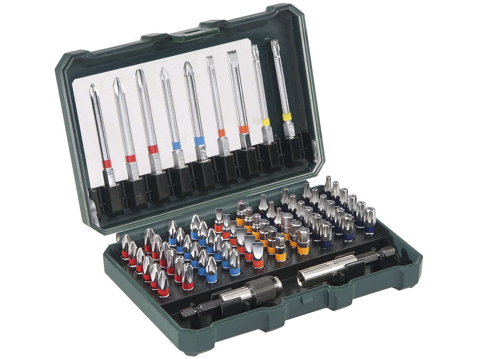 Består af: S 2-bits. L= 25 mm (60 stk.): PH 1 × 3, PH 2 × 6, PH 3 × 3, PZ 1 × 3, PZ 2 × 6, PZ 3 × 3, SL 4 × 3, SL 6 × 3, H 4 × 3, H 5 × 3, H 6 × 3, T 10 × 3, T 15 × 3, T 20 × 3, T 25 × 3, T 27 × 3, T 30 × 3, T 40 × 3. L= 75 mm (9 stk.): hhv. 1 × PH 1, PH 2, PH 3, PZ 1, PZ 2, SL 4, SL 6, T 20, T 25. 1 × magnetisk bitsholder, 1 × magnetisk lynskift-bitsholder. Bits i krom-vanadium-stål (S2-kvalitet), bits med farvekode: gør det hurtigt og nemt at finde den passende bit, magnetisk lynskift-bitsholder + magnetisk bitsholder, robust boks af høj kvalitet i specielt Metabo-design med Eurohul-ophæng, der kan trækkes ud, attraktiv salgspræsentation.