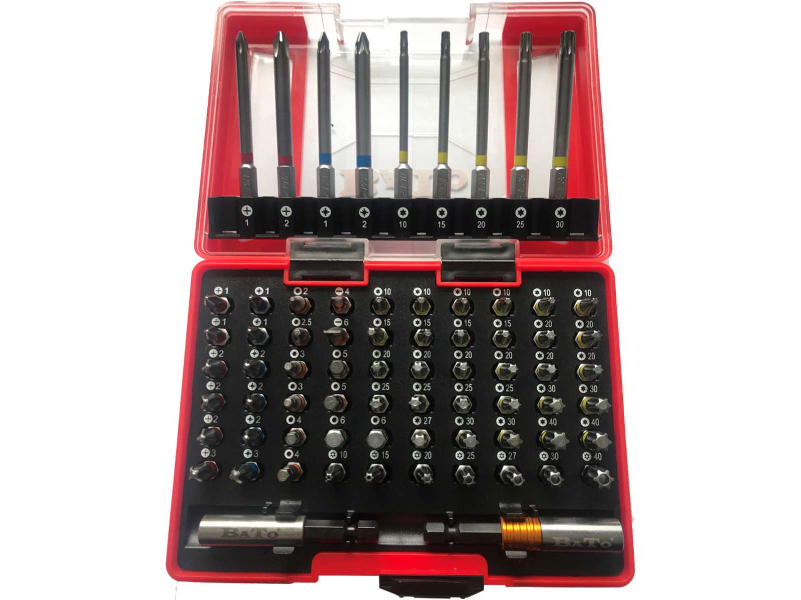 1/4" bitssæt med 71 dele med farvering. Sættet indeholder PH1 × 3 stk., PH2 × 6 stk., PH3 × 2 stk., PZ1 × 3 stk., PZ2 × 6 stk., PZ3 × 1 stk., kærv 4,0 × 2 stk., kærv 6,0 × 2 stk., 6kt 2,0-2,5-3,0-4,0-5,0-6,0 mm, TX10 × 6 stk., TX15 × 6 stk., TX20 × 6 stk., TX25 × 6 stk., TX30 × 3 stk., TX40 × 2 stk., lange bits 75 mm PH1-2, PZ1-2, TX10-15-20-25-30, bitsholder 60 mm samt QuickLock bitsholder 65 mm. Leveres i plastboks.