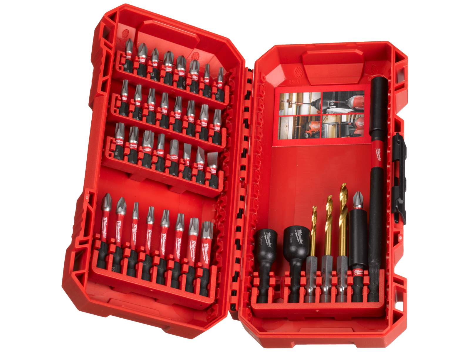 Shockwave skruebits: 25× 25 mm længde 1× PH1 / 2× PH2, 1× PZ1 / 3× PZ2, 2× TX10 / 2× TX15 / 3× TX20 / 3× TX25 / 2× TX30 / 1× TX40, 1× Hex 4 mm / 1× Hex 5 mm, 1× SL 0,6 × 4,5 / 1× SL 0,8 × 5,5 / 1× SL 1,2 × 6,5 - - - 8× 50 mm længde 1× PH2, 1× PZ2, 1× TX10 / 1× TX15 / 1× TX20 / 1× TX25 / 1× TX30 / 1× TX40 - - - Shockwave magnetisk bitholder: 1× 60 mm længde, 1× 152 mm længde - - - 3× Shockwave 1/4" Hex borebits: ø3 / 4 / 5 mm - - - 2× Shockwave magnetiske møtrikspænder: 48 mm længde 1× Hex 8 mm / 1× Hex 10 mm.
