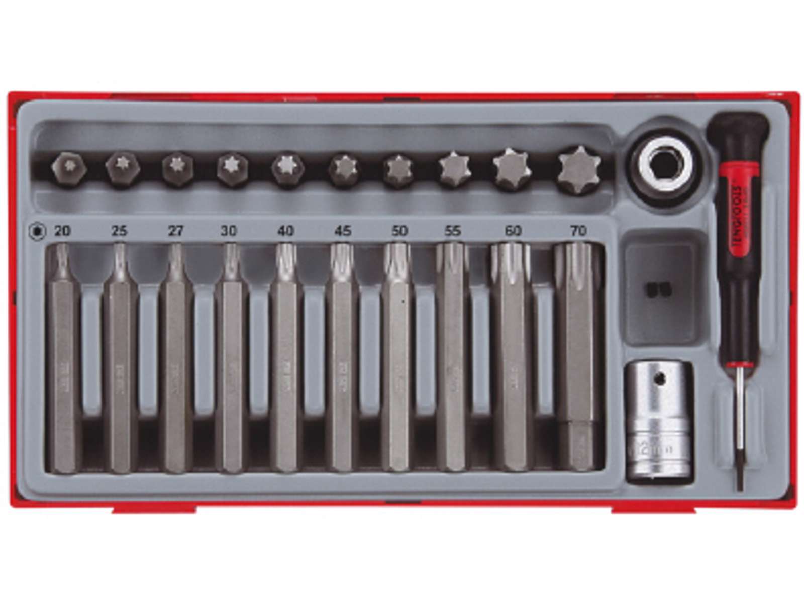 Teng Tools Sæt bestående af 20 bits (korte og lange )( 1/2" ?) til indvendige sekstandshoveder iht. TX-systemet. Til manuel tilspænding. Desuden indgår 2 bits-toppe og en sekskantet skruetrækker.