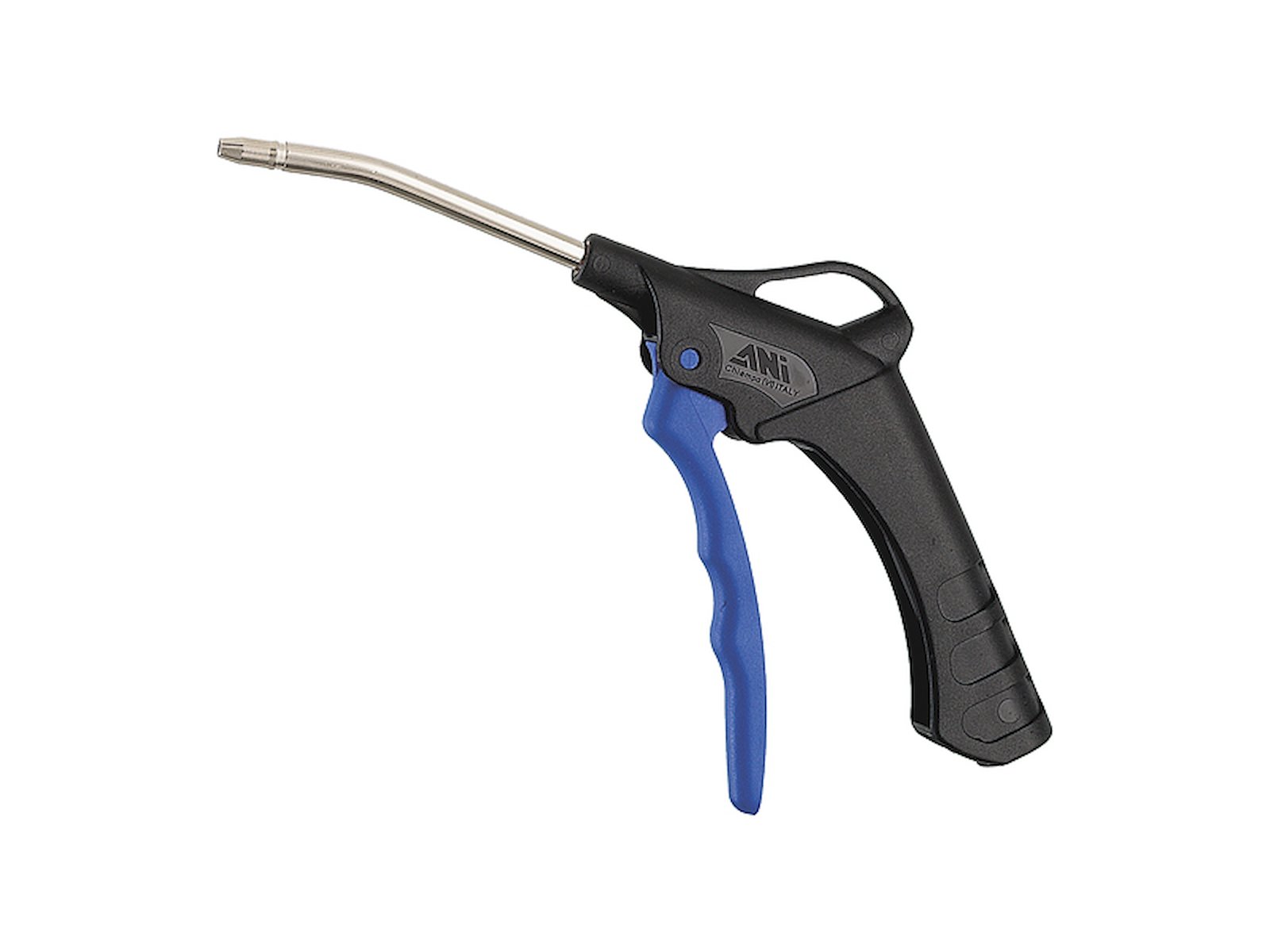 Blæsepistol med 90 mm langt, buet messing dyse. FLAIR´s professionelle AP blæsepistoler er fremstillet i slagfast PA6 materiale. Kan modstå en belastning på op til 350 kg. Messingbøsninger, der tillader et hurtig skift af dysen eller niplen uden at beskadige pistolen.
