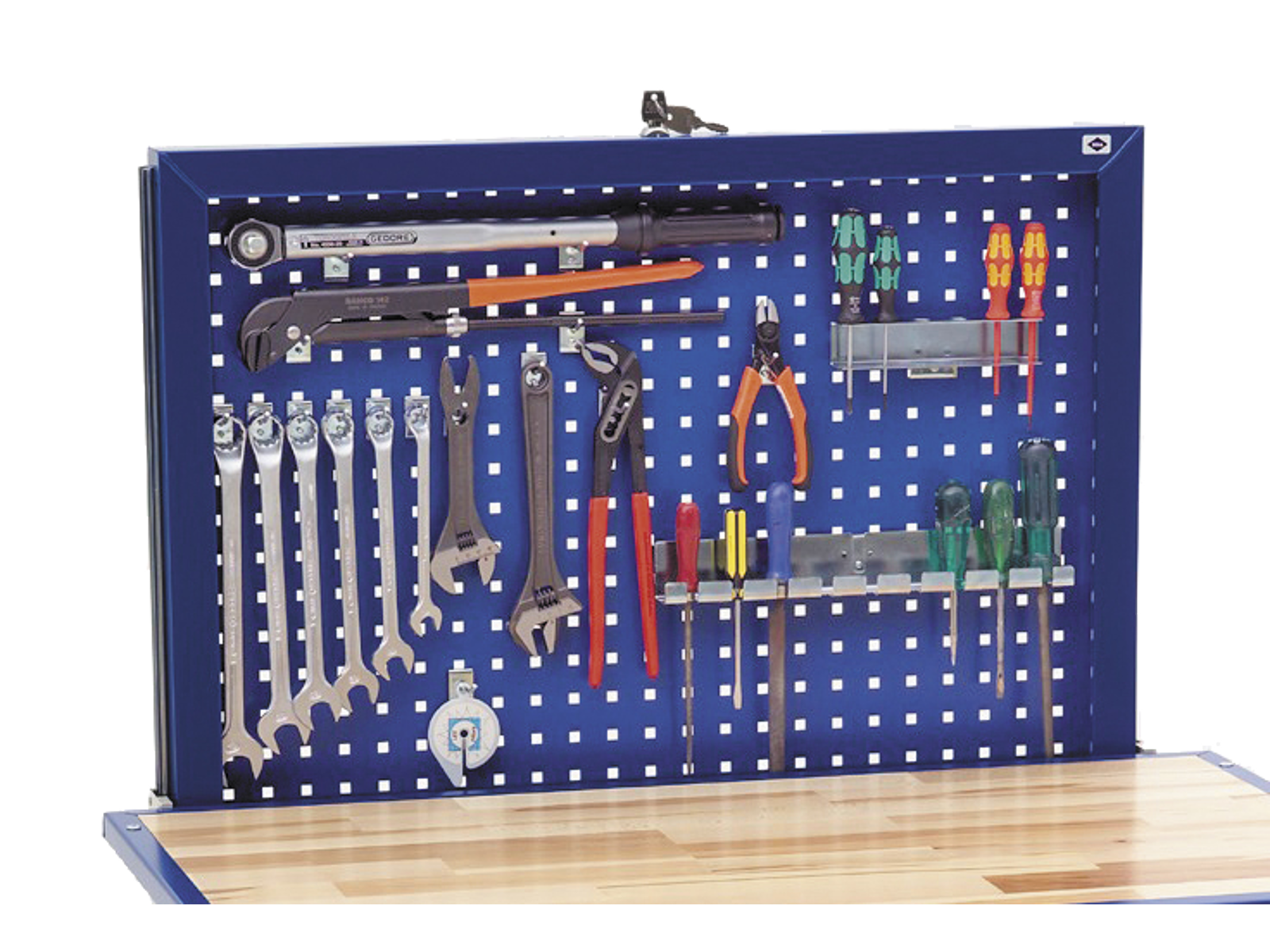 Værktøjstavle/elevatortavle til VV-2 og VV-3 værkstedsvogne. Nedsænkes i niveau med bordpladen for skjult og sikker opbevaring af værktøj - aflåselig og med automatisk hævefunktion. Belastning 14 kg. Kan eftermonteres på eksisterende vogn.