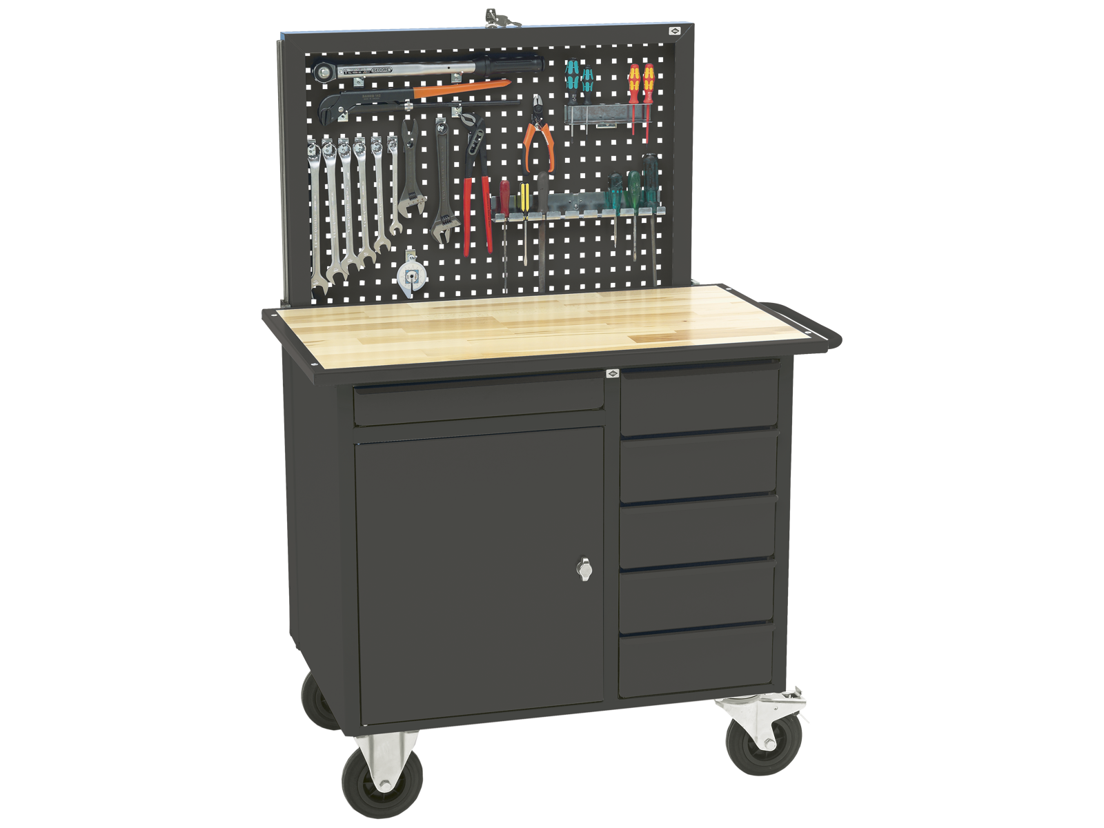 Værkstedsvogn i RAL-farve 7016 med bøgeparket-bordplade, stålramme og hjul (to faste og to drejelige med bremse). Model med fem smalle skuffer, en bred skuffe samt en skabssektion. Alle skuffer er med letløbende rulleudtræk og skabssektionen leveres med en flytbar, galvaniseret hylde (bæreevne 30 kg). Vognen leveres desuden med centralt låsegreb, forberedt for hængelås. Bæreevne bred skuffe 30 kg, og smalle skuffer 35 kg pr. skuffe. Belastning af hele vognen ved bremset tilstand 1.000 kg og i bevægelse 500 kg. Monteret med værktøjstavle (VT-1).
