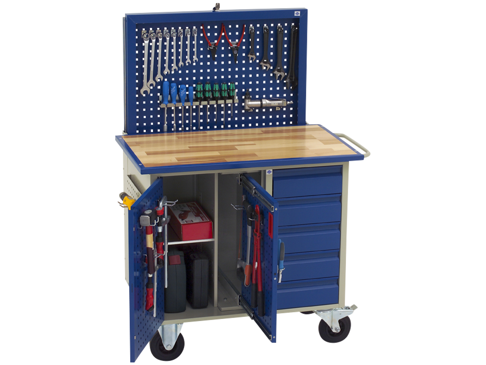 Værkstedsvogn med bøgeparket-bordplade, stålramme og hjul (2 faste og 2 drejelige med bremse). Model med fem skuffer samt en skabssektion og tegningslomme. Alle skuffer er med letløbende med stålkugleudtræk og enkelt skuffespærre. Skabssektionen er med dobbeltplade skabsdør med værktøjstavle på indvendig side og en flytbar galvaniseret hylde (belastning 30 kg). Desuden er modellen forsynet med centrallås og tegningslomme på siden, som også kan bruges som værktøjstavle. Bæreevne pr. skuffe 45 kg. Belastning af hele vognen ved bremset tilstand er 1.000 kg og i bevægelse 500 kg. Fås både med og uden værktøjstavle.