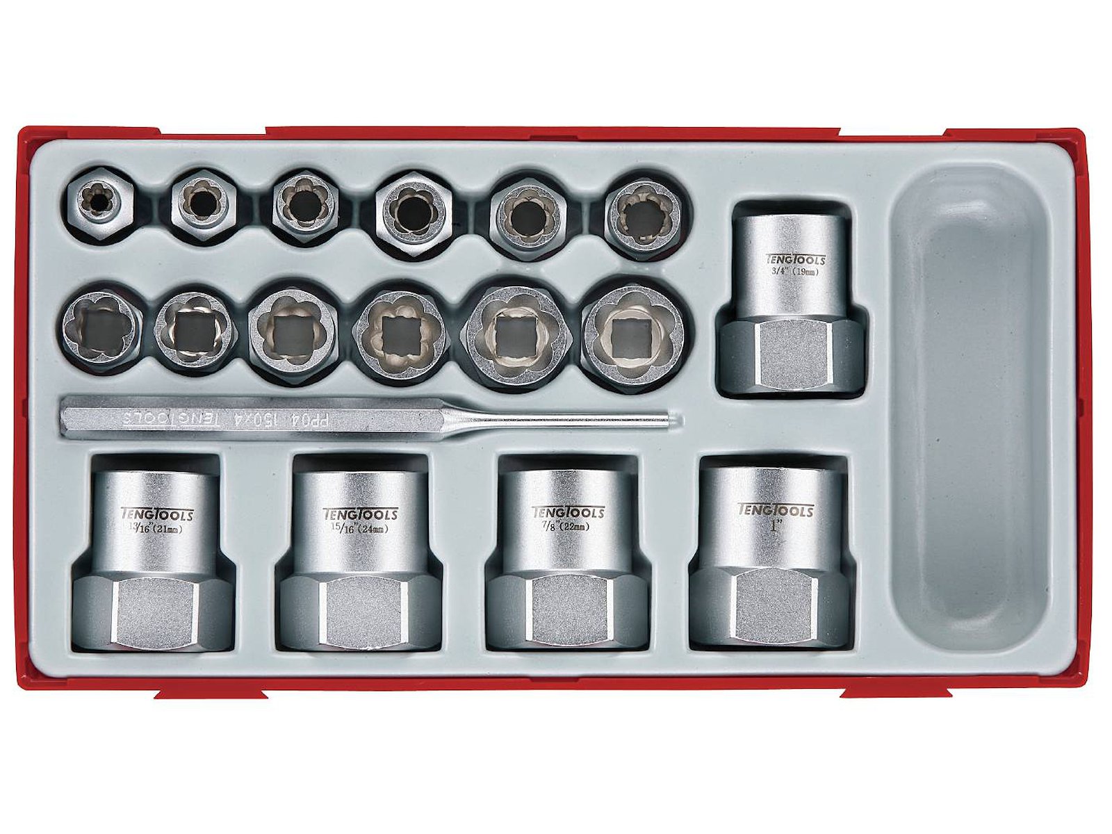 Sæt med 18 dele. Til at løsne beskadigede bolthoveder og møtrikker med. Indeholder sekskantudtrækkere med 3/8'' og 1/2'' firkantfatning samt en 4 mm cylindrisk drivdorn.