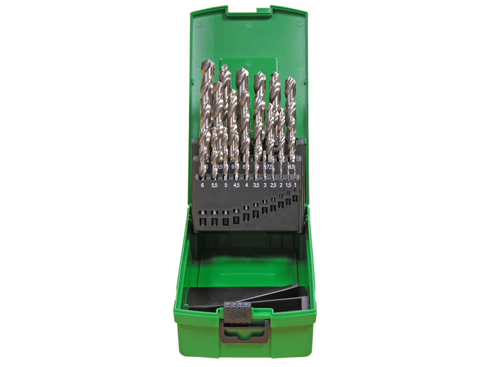 DJ TOOLS borsæt DIN338 HSS-G med slebne spiralbor 1-13×0,5 mm i grøn DJ plastboks. Til anvendelse i stål, stålgods legeret og ulegeret op til 900 N/mm² styrke. Grå-, temper-, sejjern- og trykgods, sinterjern, nysølv, grafit, kortspåntagende aluminiumslegeringer, messing og bronze.