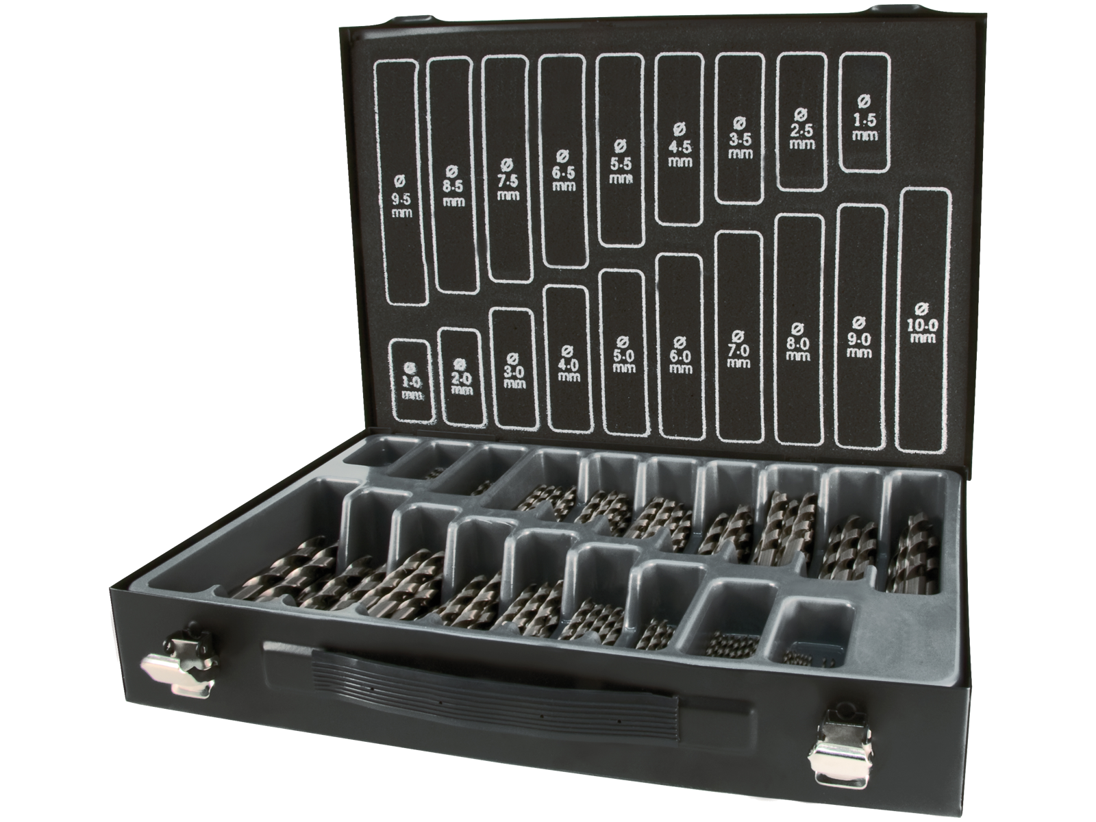 Borkuffert med 170 slebne spiralbor DIN338 HSS-G 1-10×0,5 mm. Indeholder 10 stk 1-8 mm samt 5 stk 8,5-10 mm. Til anvendelse i stål, stålgods legeret og ulegeret op til 900 N/mm² styrke. Grå-, temper-, sejjern- og trykgods, sinterjern, nysølv, grafit, kortspåntagende aluminiumslegeringer, messing og bronze.