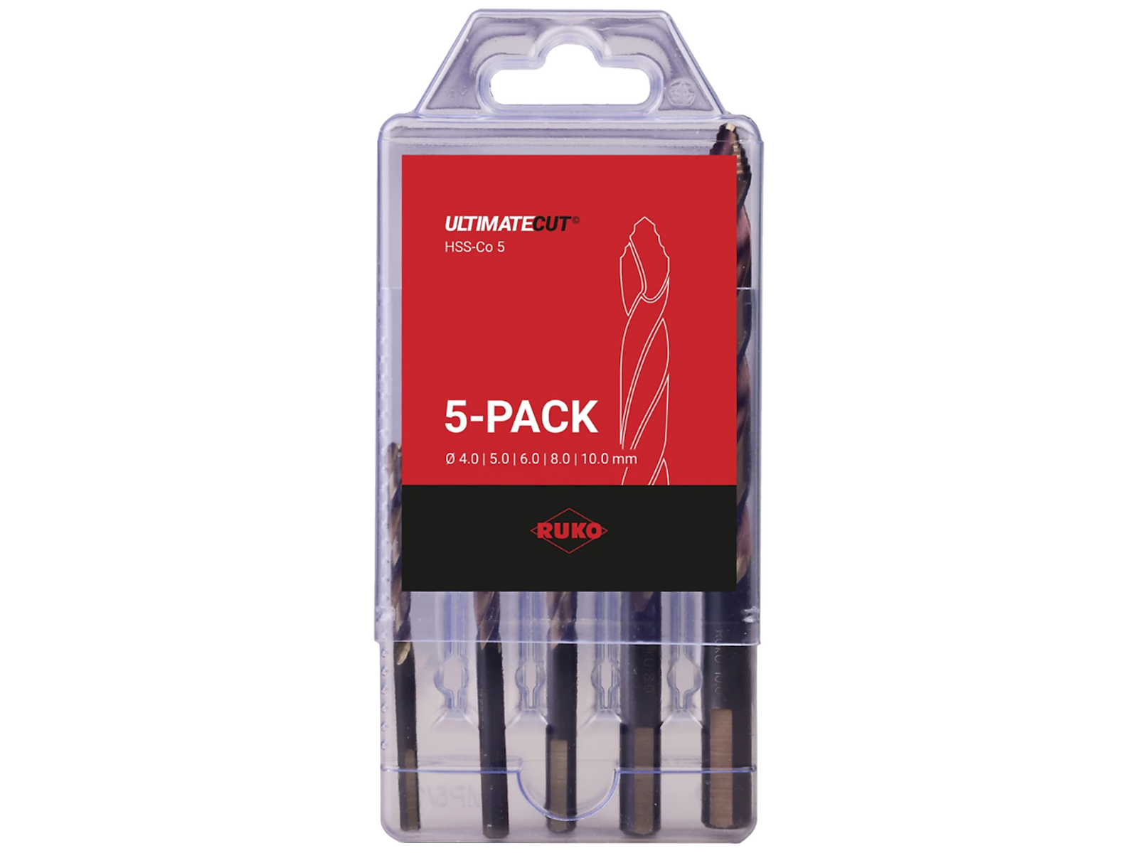 UltimateCut spiralborsæt til boring i bl.a. rustfri samt syre- og varmebestandigt stål. Flowstep-spids - borer op til 5× flere huller, dobbelt så hurtig som standardbor. Skaft med 3 spændeflader. Sæt med 5 størrelser: 4,0 / 5,0 / 6,0 / 8,0 / 10,0 mm.