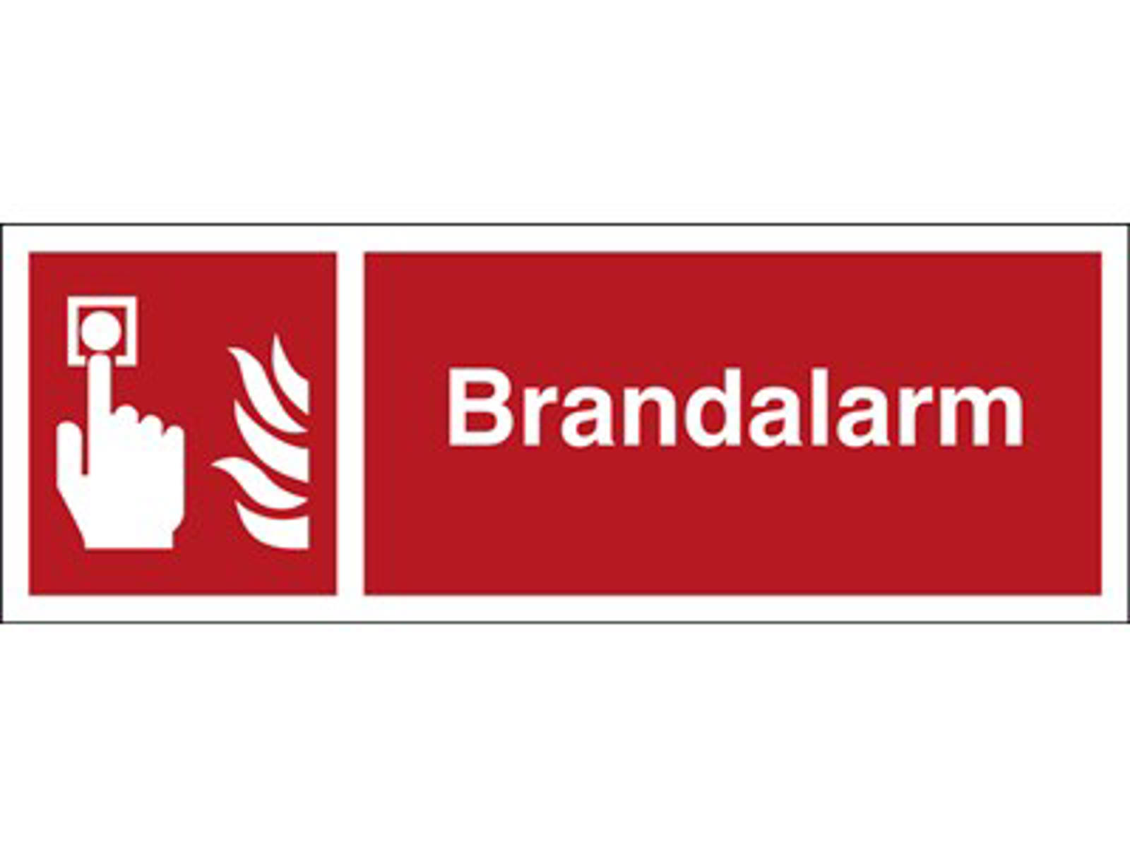 Brandskilt med den danske tekst 'Brandalarm ' med tekst og symbol der følger DS/EN ISO 7010:2011 (Sikkerhedsskilte), samt forskrifter for sikkerhedsskilte, i henhold til Arbejdstilsynets bekendtgørelse nr. 518