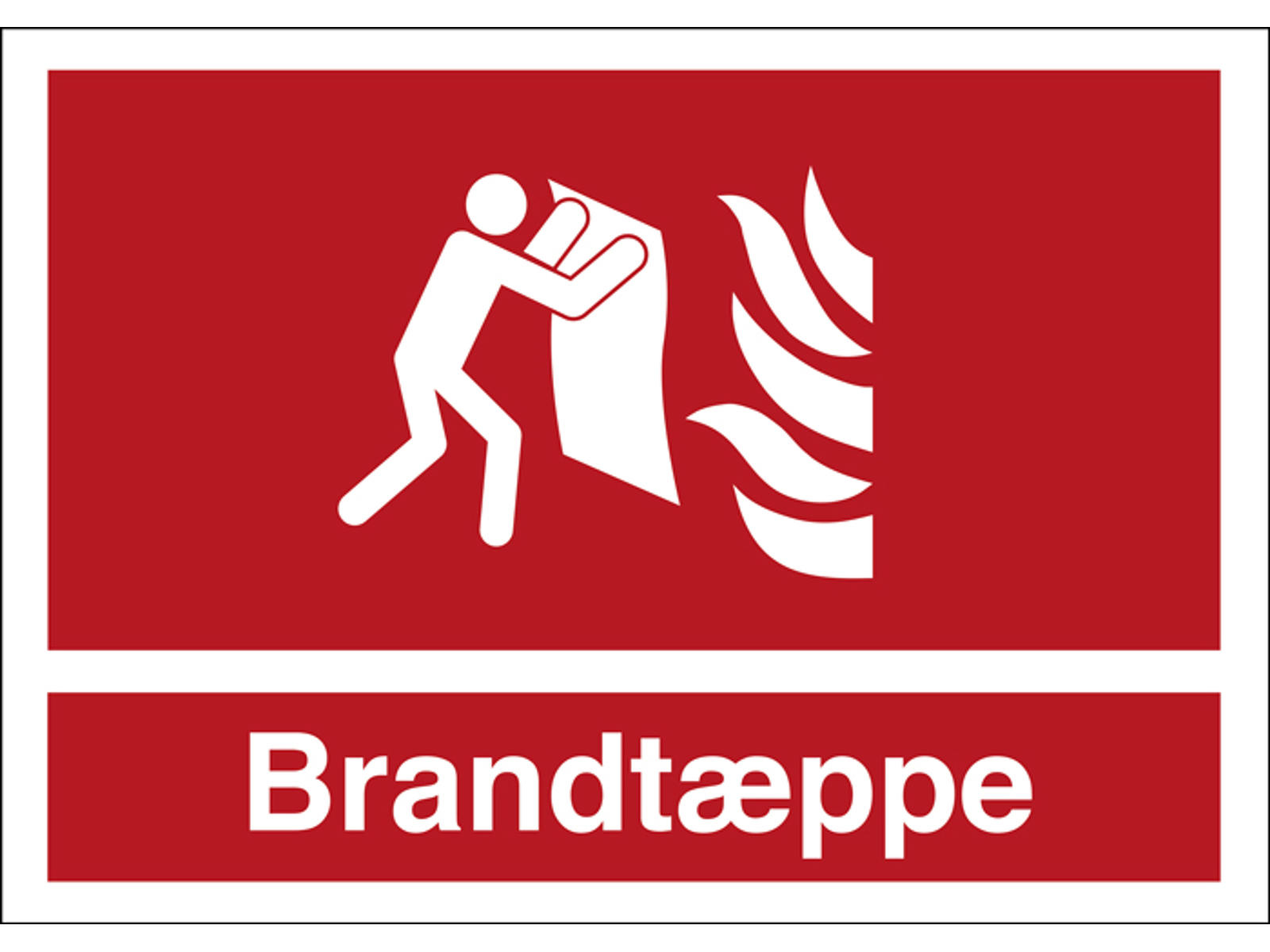 Brandskilt med den danske tekst 'Brandtæppe ' med tekst og symbol der følger DS/EN ISO 7010:2011 (Sikkerhedsskilte), samt forskrifter for sikkerhedsskilte, i henhold til Arbejdstilsynets bekendtgørelse nr. 518