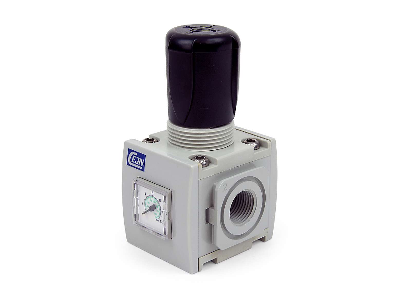 Regulator 652. Regulatoren har til hensigt at regulere lufttrykket og holde det konstant. Dette er specielt vigtigt i forbindelse med visse trykluftssudstyr. Model 652 sikrer minimale trykforskelle mellem sætpunkt og driftstryk. Model 652 har et justeringsområde på 0.5-10 bar for opretholdelse af det krævede trykniveau. Regulatoren har en rullende membran for maksimal levetid, et manometer til kontrol af trykket, samt en låseanordning til forhindring af utilsigtet justering. Den høje flowkapacitet på op til 7.000 ltr./min. og det lave trykfald sparer energi og reducerer driftsomkostningerne. Applikationsområder: Stort set alle industrier, så som fremstillingsindustrien, fødevareindustrien, forarbejdningsindustrien, tømrerindustrien, papirfabrikker, etc., er afhængige af trykluft som energikilde. Luftbehandlingssystemer er særligt vigtige i trykluftsnet med adskillige luftudtag og et omfattende rørledningssystem.