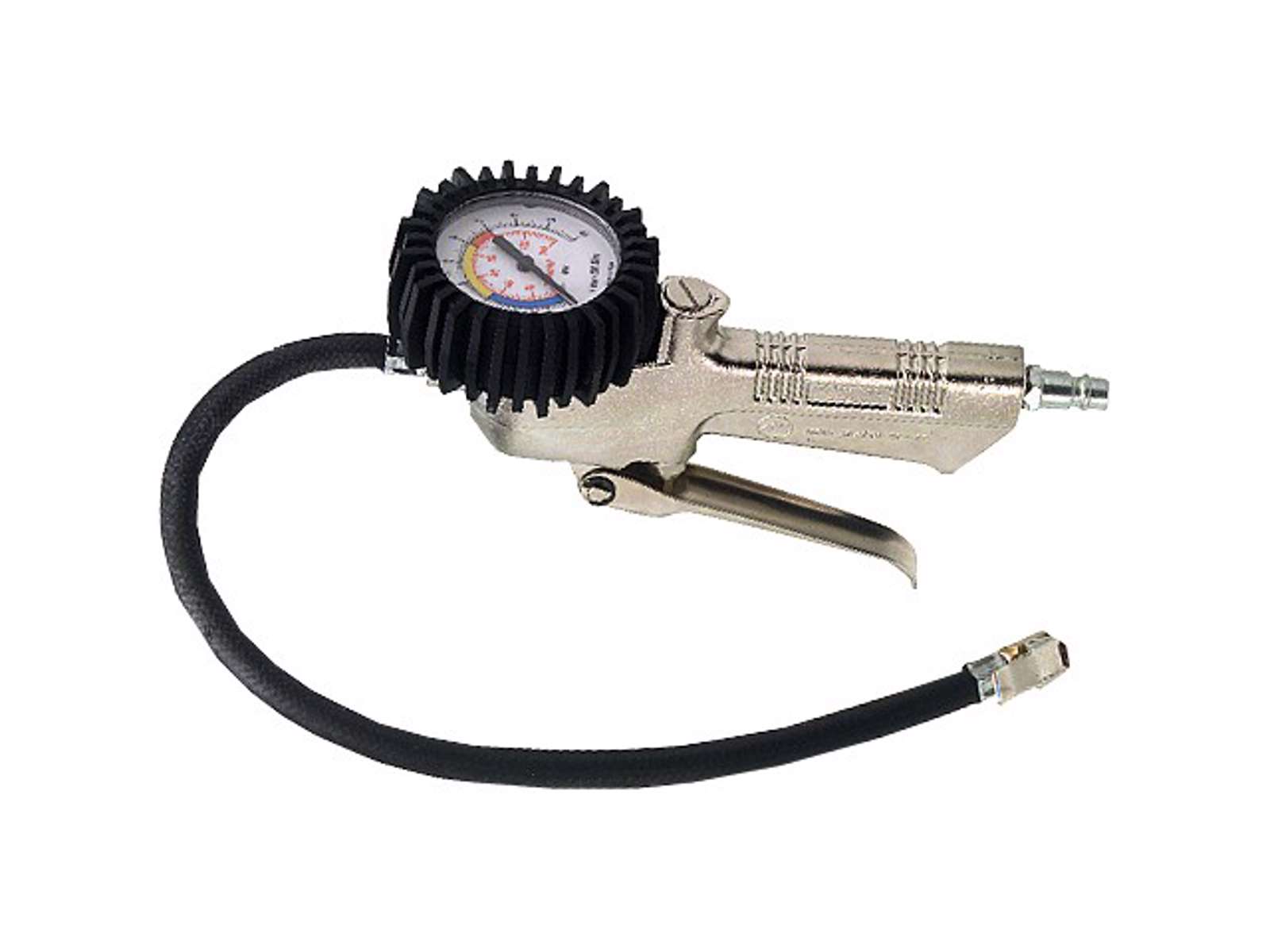 Til bildæk. Både påfyldning og udslip af luft sker med aftrækkeren. Godkendt iht. gældende CEE normer Trykmåleren har beskyttelsesglas og beskyttelseskappe af gummi. Luftslangen har lås til ventilen. Forniklet udførelse af aluminium.