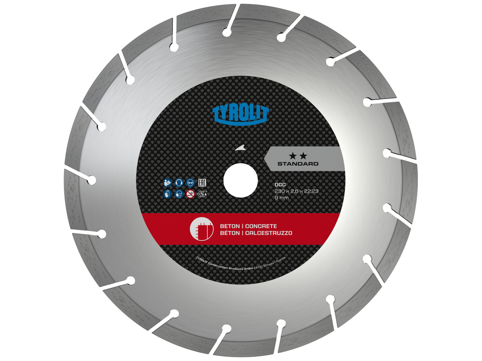 Standard ** DCC diamantklinge til tørskæring med vinkelsliber. Anvendelig i f.eks. beton, armeret beton, betonprodukter, hårde materialer mv. Form C73. Hul 22,23 mm.