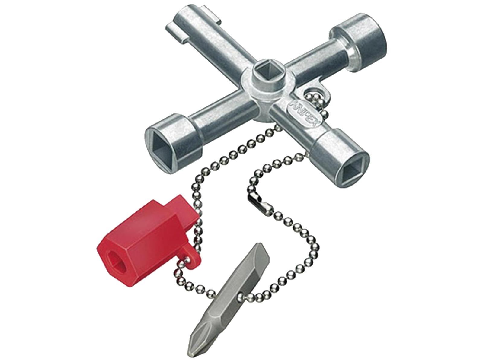 Til styreskabe, spærresystemer til gas-, vand- og elektricitetsforsyning. Til tekniske anlæg i bygninger, f.eks. klima- og ventilationsanlæg, spærreventiler, netstyretavler osv. Med bit-indsats: kærv 1,0×7 mm og krydskærv PH2. Med adapter til 1/4" bits på en befæstelseskæde. Yderligere bitholder til 1/4"-bits i en arm. Zinktrykstøbning. Lang udførelse, armlængde ialt: 76 mm. Yderligere firkant 5 mm.