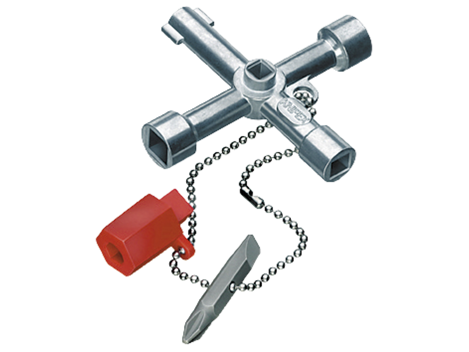 Styreskabsnøgle til almindelige skabe og spærresystemer 76 mm. Til styreskabe, spærresystemer til gas-, vand- og elektricitetsforsyning. Til tekniske anlæg i bygninger, f.eks. klima- og ventilationsanlæg, spærreventiler, netstyretavler osv. Med bit-indsats med kærv 1,0×7 mm og krydskærv PH2. Med adapter til 1/4" bits på en befæstelseskæde. Yderligere bitholder til 1/4"-bits i en arm. Zinktrykstøbning. Lang udførelse, armlængde ialt: 76 mm. Yderligere firkant 5 mm.