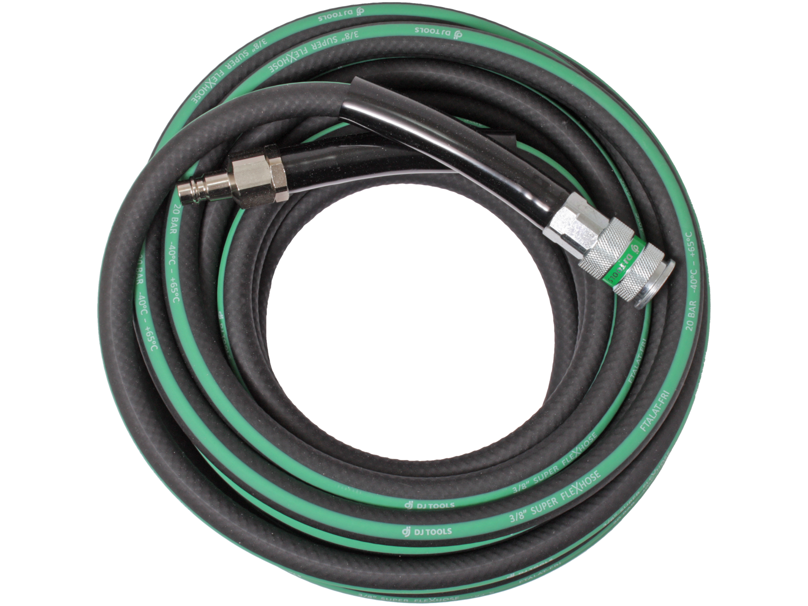 Superfleksibel trykluftslange (3/8") af polymer/gummi komposit med fletforstærkning (ftalatfri). Monteret med kvalitetskobling og sikkerhedsnippel. Tåler højt tryk helt op til 20 bar. Holder fleksibiliteten selv ved lave temperaturer (÷40°C til +65°C). Fås i to længder.