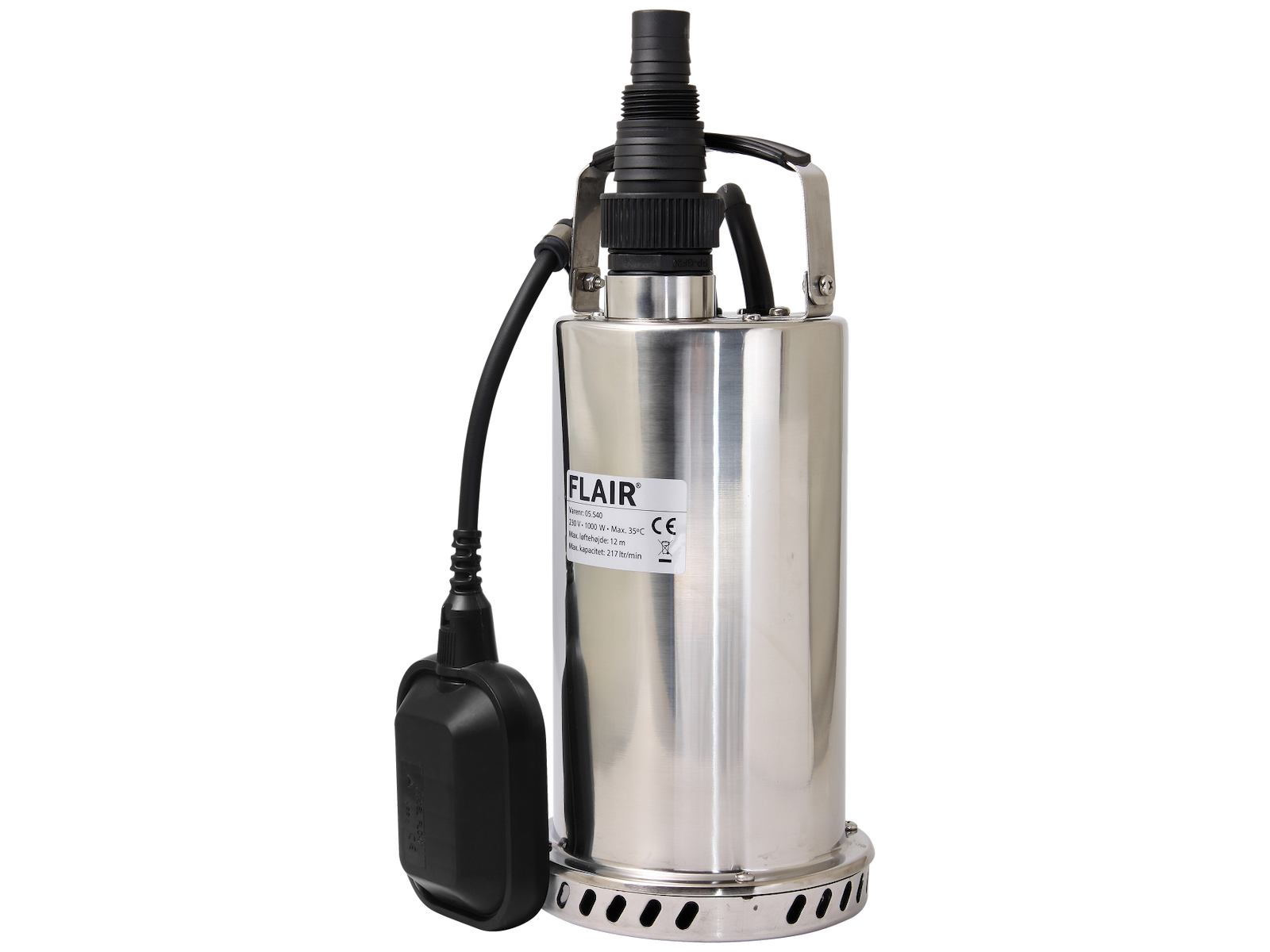 Transportabel rustfri dykpumpe med slangeafgang i toppen. Anvendes til grundvandstømning samt tømning af kældre og beholdere. Pumper rent eller let snavset vand. Vandtemperatur 35°C. Pumpen bør ikke anvendes til kontinuerlig drift. Leveres med 10 mtr. kabel. Min. brønddiameter ø400 mm. Slangestuds til 1" og 1.1/2" slange medfølger.