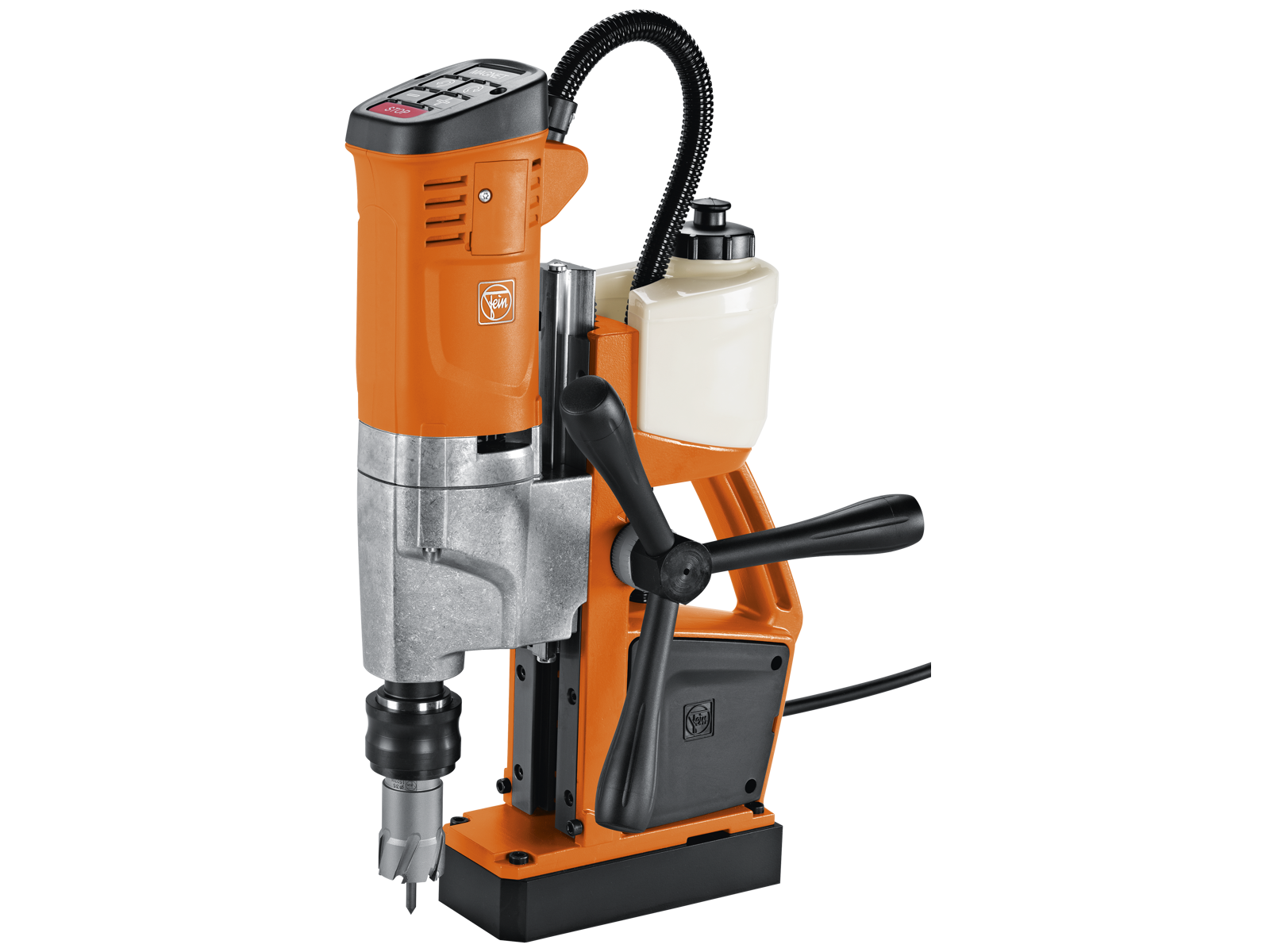 Kompakt 1-gears universal magnetkerneboremaskine med stort arbejdsområde og med højre-/ venstreløb og suveræn funktionalitet til fleksible arbejdsopgaver. Maskinen har højre-/venstreløb, elektronisk indstilling af omdrejningstal og 260 mm totalvandring, hvilket muliggør en bred vifte at arbejdsopgaver, herunder kerne-, spiral-, gevindboring samt undersænkning og rivning. Derudover: Enkelt betjeningskoncept let tilgængeligt for brugeren, vippesensor, ekstra magnetafbryder i borestanderen, integreret kølemiddelbeholder, flytbart fremføringshåndtag, omdrejningstalhukommelse "Memory Function", samt sikkerhedsafbryder. HM kernebor maks. ø35 mm, HSS kernebor maks. ø35 mm, kernebor boredybde maks. 50 mm, spiralbor maks. ø16 mm, gevindskæring M14, undersænkning maks. ø31 mm, rivning maks. ø16 mm, borholder 3/4" Weldon, vandring 135 mm, total vandring 260 mm, magnetholdekraft 10.000 N, magnetfod 175 × 80 mm. 4 mtr. kabel. Leveres inkl. kølemiddelbeholder, fastsurringsstrop, spånkrog, centerstifter, berøringsbeskytter, samt kuffert.
