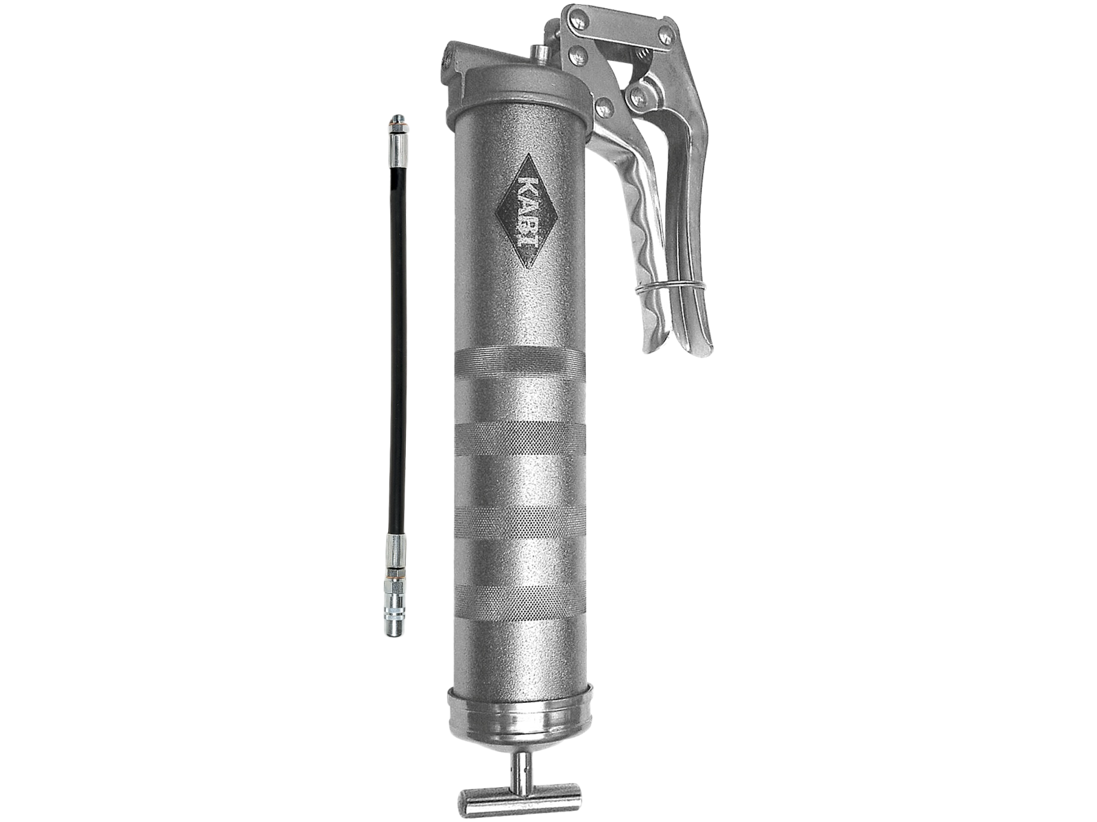 KABI enhånds fedtpresser 450. Kan anvendes til såvel patroner som løst fedt samt fyldning fra fedtfylder. Max. ydelse 345 Bar. Leverer ca. 0,5 g. pr. slag. Med 300 mm slange samt 4-bakket smørehoved. Tilslutningsgevind 1/8"R. Indhold 400/500 gram. Leveres i kartonæske.