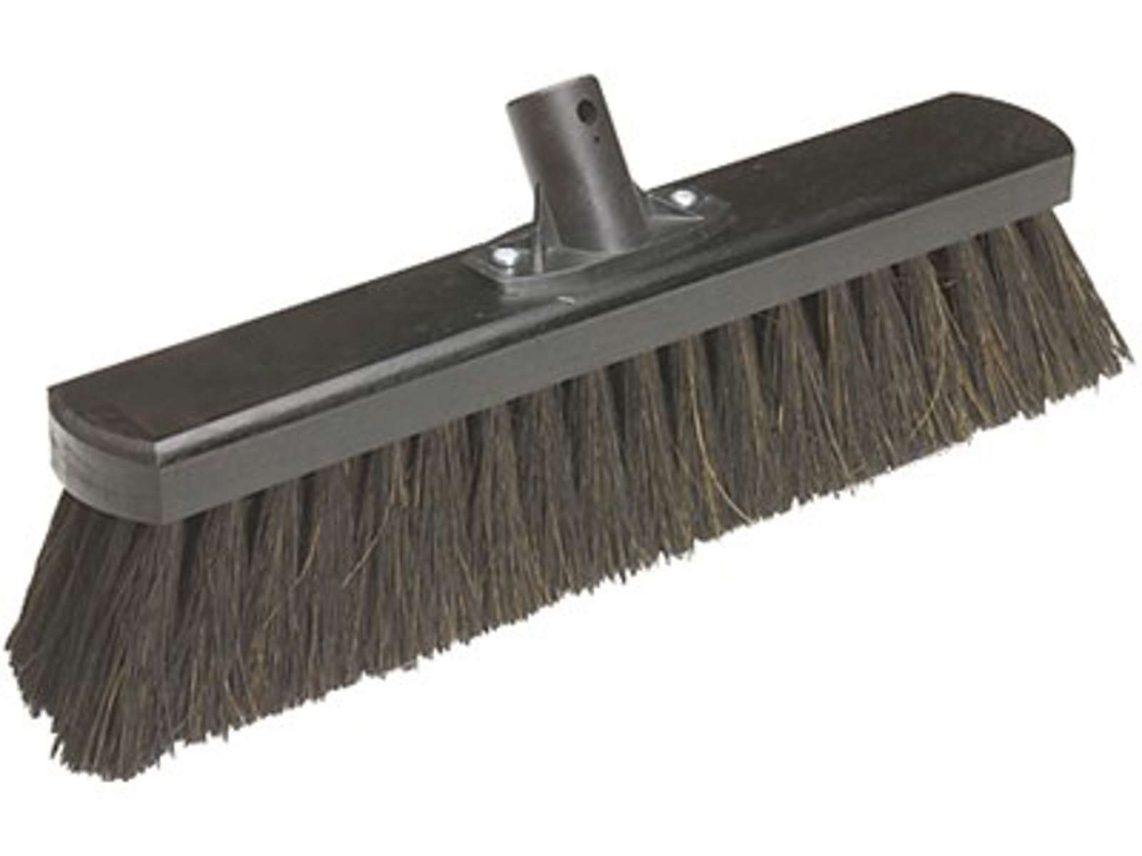 Værkstedskost i træ med gevindsocket til skafter med gevind. Kosten har stive PVC-filamenter, som er velegnede til fejning af vådt og olieret affald.