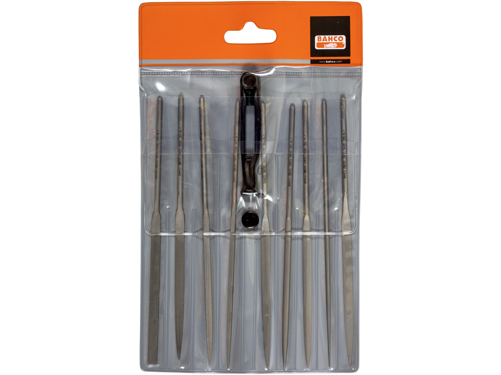 Nålefilesæt med 9 dele. Nålefile med mellem-hugning til finfiling og polering - fortrinsvis ved gravørarbejde, finmekanik, instrument-, guldsmede- og urmagerarbejde. Sættet indeholder 1 stk. af hver af typerne: ansats, flad, halvrund, rund, trekant, firkant, oval, fugletunge og kniv samt 1 stk. nålefilehæfte. Leveres i praktisk opbevaringslomme.