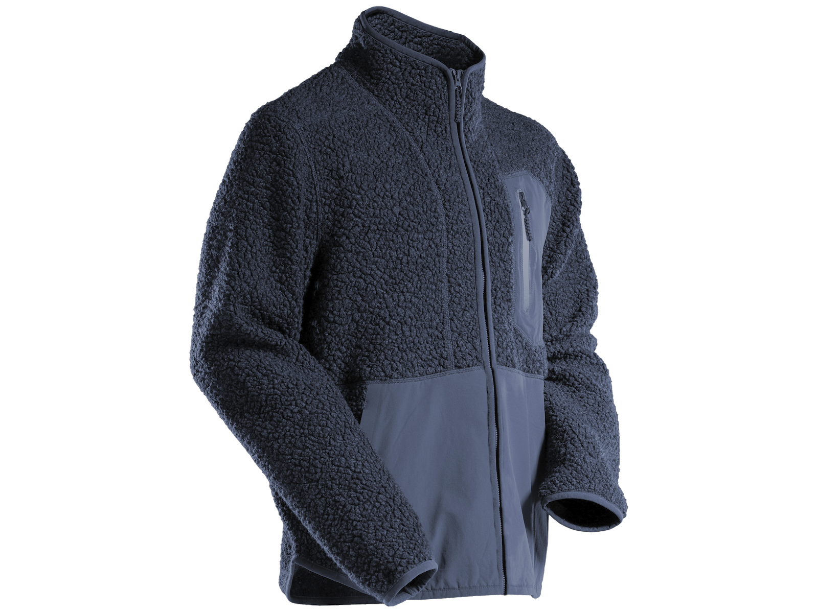 Customized fiberpelsjakke med gennemgående lynlås. Modellen har brystlomme med lynlås, forlommer med forstærkning samt elastikbånd ved håndled og i nedre kant. Jakken er let-isolerende og kan bruges som mellemlag eller yderste lag på en forårsdag. Fremstillet med en høj andel af genanvendt polyester (80 %) i hovedmaterialet. Oeko-Tex Standard 100.