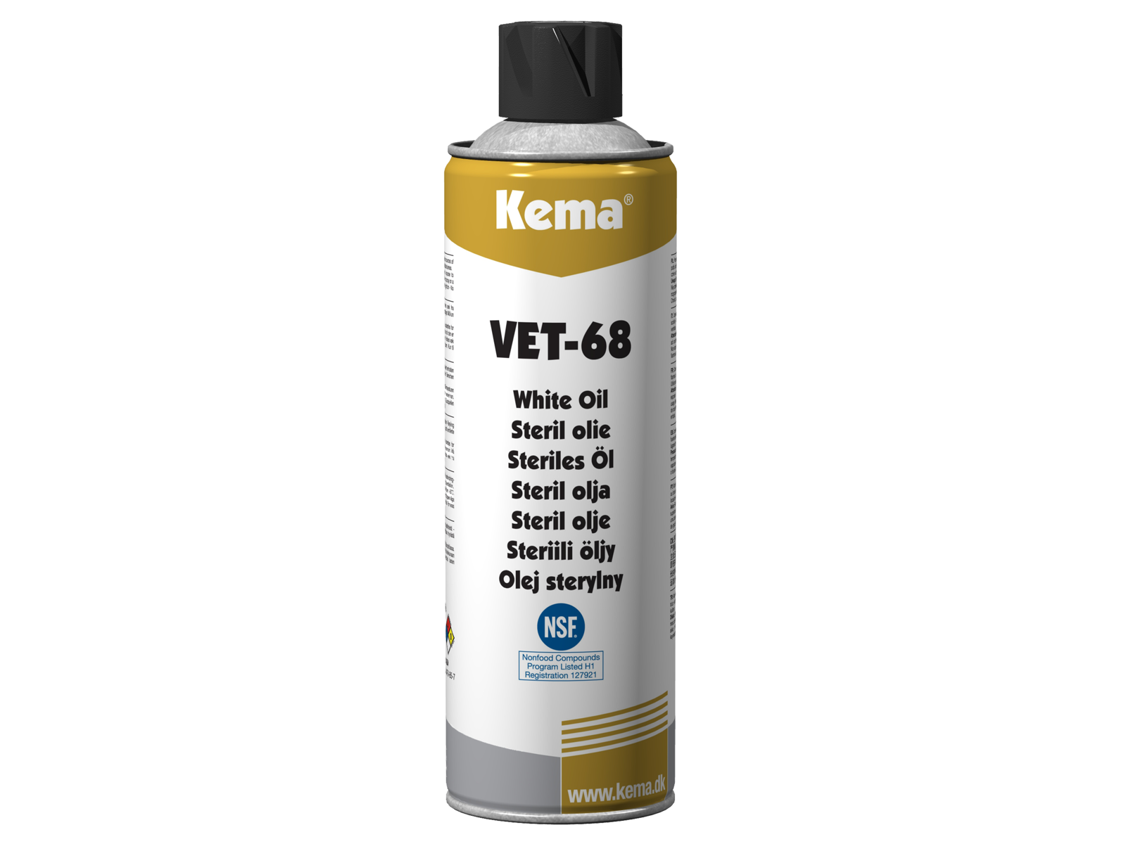• VET-68 er en speciel raffineret syrefri hvid olie, der opfylder de medicinske renhedskrav til brug indenfor fødevarevirksomheder, hospitaler og apoteker. Anvendes som smøremiddel til kæder, kabler, ruller, knaster, transportører, styreskinner, slæder, stempler, drejehjul, kæde- og tandhjul. Rustbeskytter og smører. VET-68 har en god vedhæftningsevne og kan tåle vand- og dampafskylning. Anvendes indenfor en lang række industrier, hvor der er behov for en helt farveløs olie samt til smøring i produktioner, hvor der ikke må forekomme misfarvning af færdigvarer. Anvendes endvidere indenfor tekstilindustrien samt i kosmetik-, medicinal- og fødevareindustrien, hvor der er store krav til hygiejnen, og hvor lejlighedsvis kontakt med fødevarer ikke kan udelukkes. Lever op til kravene i henhold til FDA 21 CFR 178.3570 til brug inden for fødevareindustrien og er registreret under NSF-H1. Egenskaber: NSF-registreret H1, allround smøremiddel, højt raffineret, beskytter mod rust, misfarver ikke færd