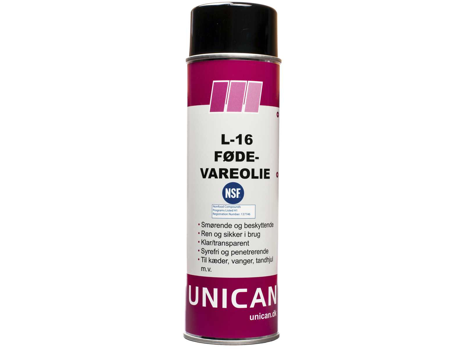 NSF-H1 Godkendt. L-16 Fødevareolie er udviklet specielt til fødevare og medicinalindustrien. Meget velegnet til smøring i industrier, hvor en syrefri transparent oliefilm ønskes. L-16 Fødevareolie dækker et meget bredt behov for smøring. Indenfor levnedsmiddelsektoren, anvendes L-16 til smøring af kæder, tandhjul, aksler, lejer, vanger, transportører, gear, kabler m.m. L-16 Fødevareolie tåler vandafskylning og virker effektivt indenfor et bredt temperaturområde fra -30°C til +180°C. L-16 Fødevareolie efterlader en lugt og smagsfri transparent film, som giver fremragende smørende og korrosionsbeskyttende egenskaber og som i levnedsmiddelindustrien effektivt kan anvendes til at holde diverse rustfri maskiner i perfekt stand.