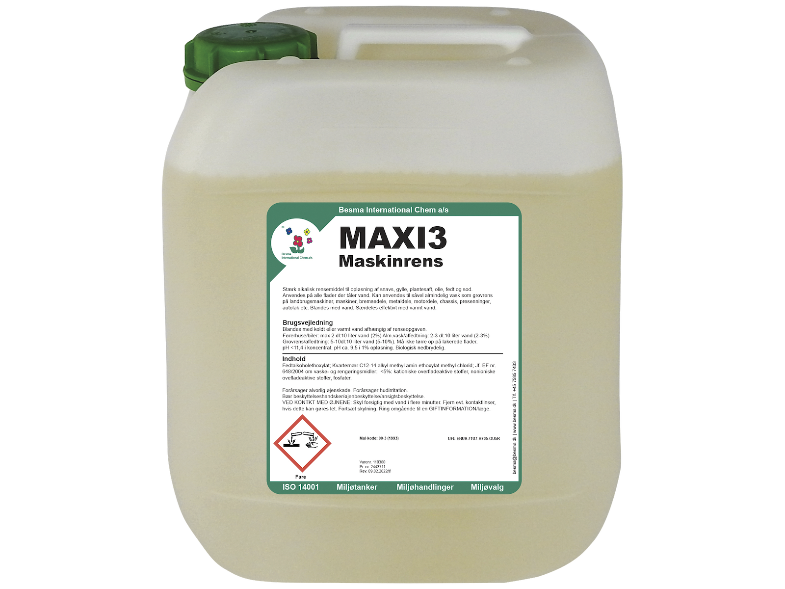 Maxi 3 Maskinrens er et stærk alkalisk rensemiddel til opløsning af snavs, gylle, plantesaft, olie, fedt og sod. Anvendes på alle flader der tåler vand. Kan anvendes til såvel almindelig vask som grovrens på landbrugsmaskiner, maskiner, bremsedele, metaldele, motordele, chassis, presenninger, autolak etc. Blandes med vand, særdeles effektivt med varmt vand. Let biologisk nedbrydeligt. pH-værdi koncentreret 11,4 og pH-værdi i 1 % opløsning 9,5.