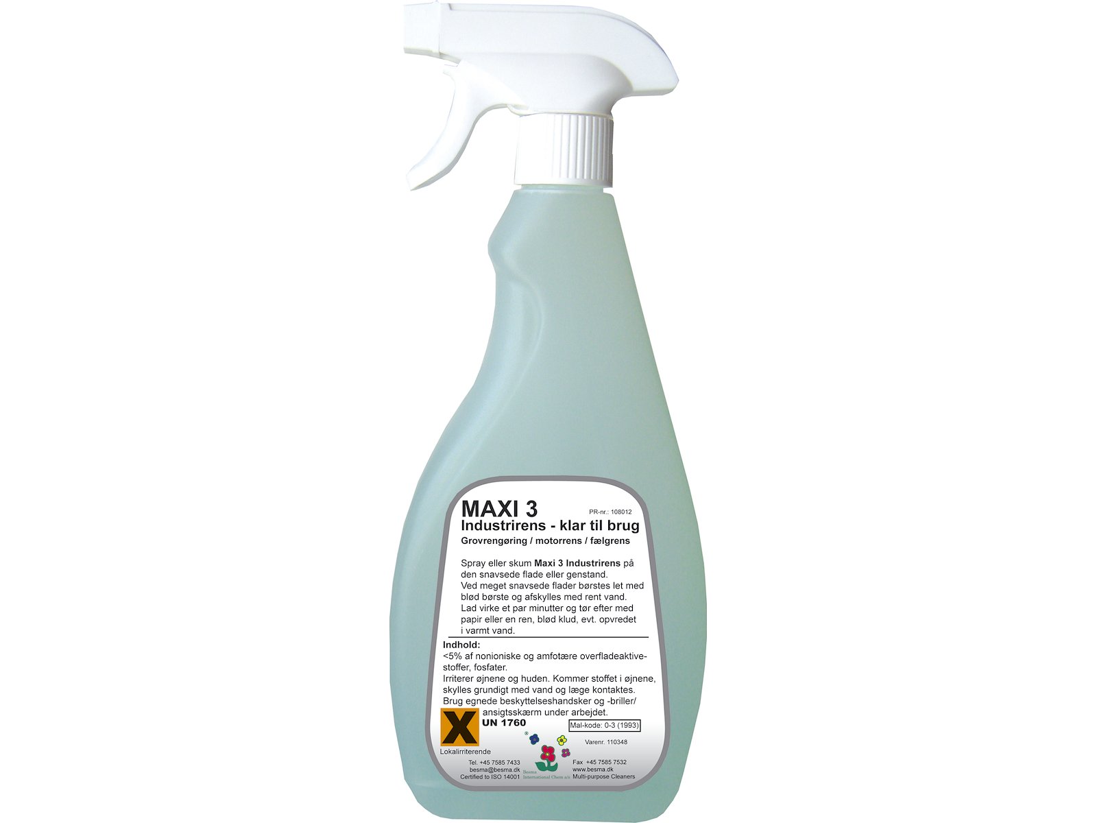 Maxi 3 Industrirens er et koncentreret, stærk alkalisk grovrengøringsmiddel til affedtning, oliefjerning samt motorrens og gulvvask hvor oliespild forekommer. Opløser olie, sod, fedt, smuds, bremse- støv og copolymerer vokstyper.