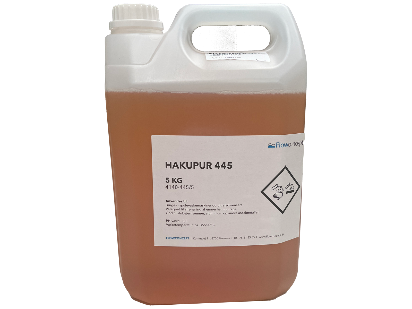 Hakupur 445 rensevæske til brug i spulevaskemaskiner og ultralydsrensere. Velegnet til afrensning af emner før montage. God til støbejernsemner, aluminium og andre ædelmetaller. pH-værdi: 10,3. Temperatur ca. 35-70°C. Koncentration 5-10 %.