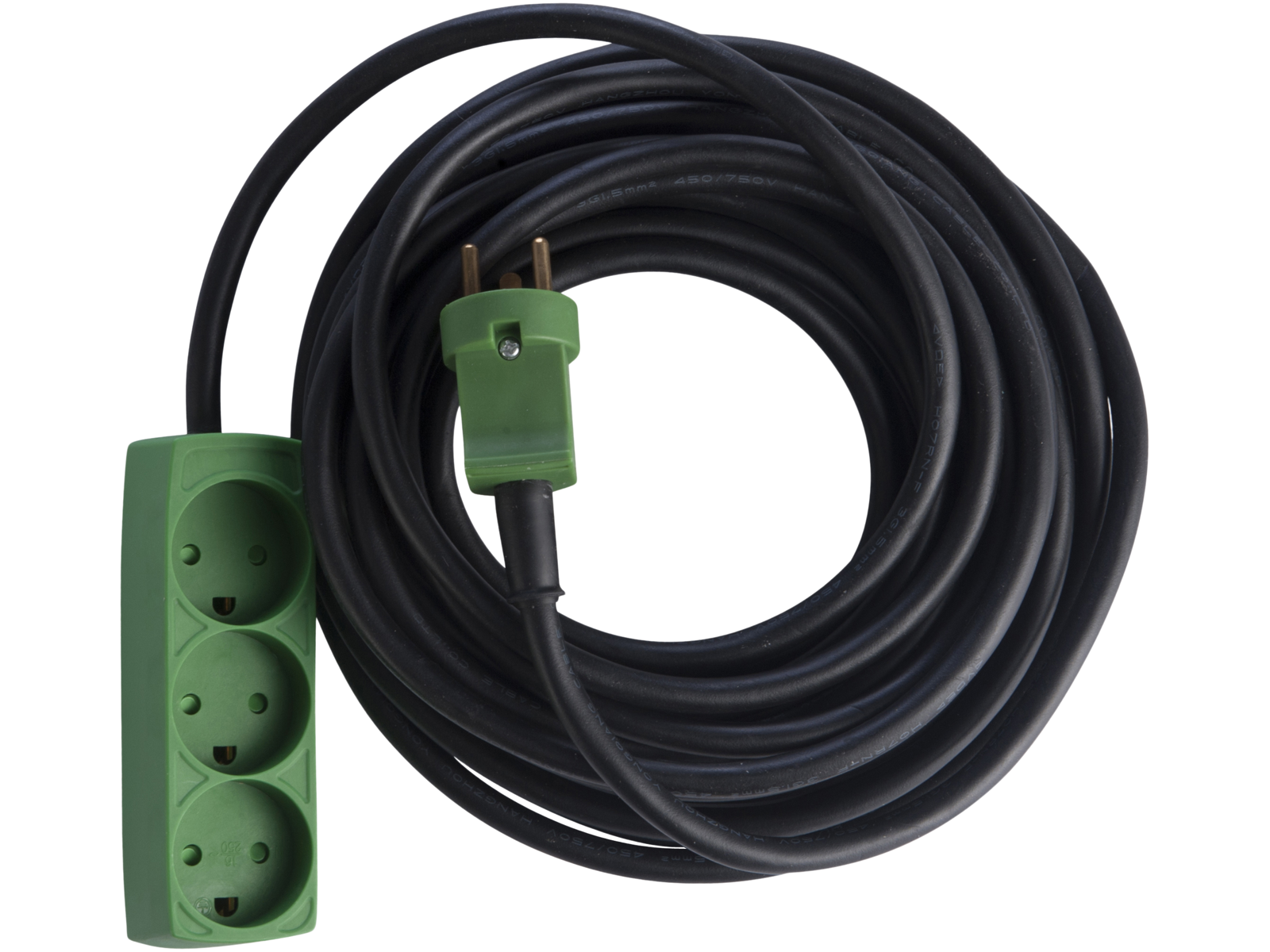 Kabelsæt med DK stikprop og 3-vejs stikdåse med jord. Med 3G1,5 mm² neopren-gummikabel H07RN-F. 230 V, 16 A. 3.680 W. IP20. Fås i 3 længder: 10, 15 og 25 mtr.