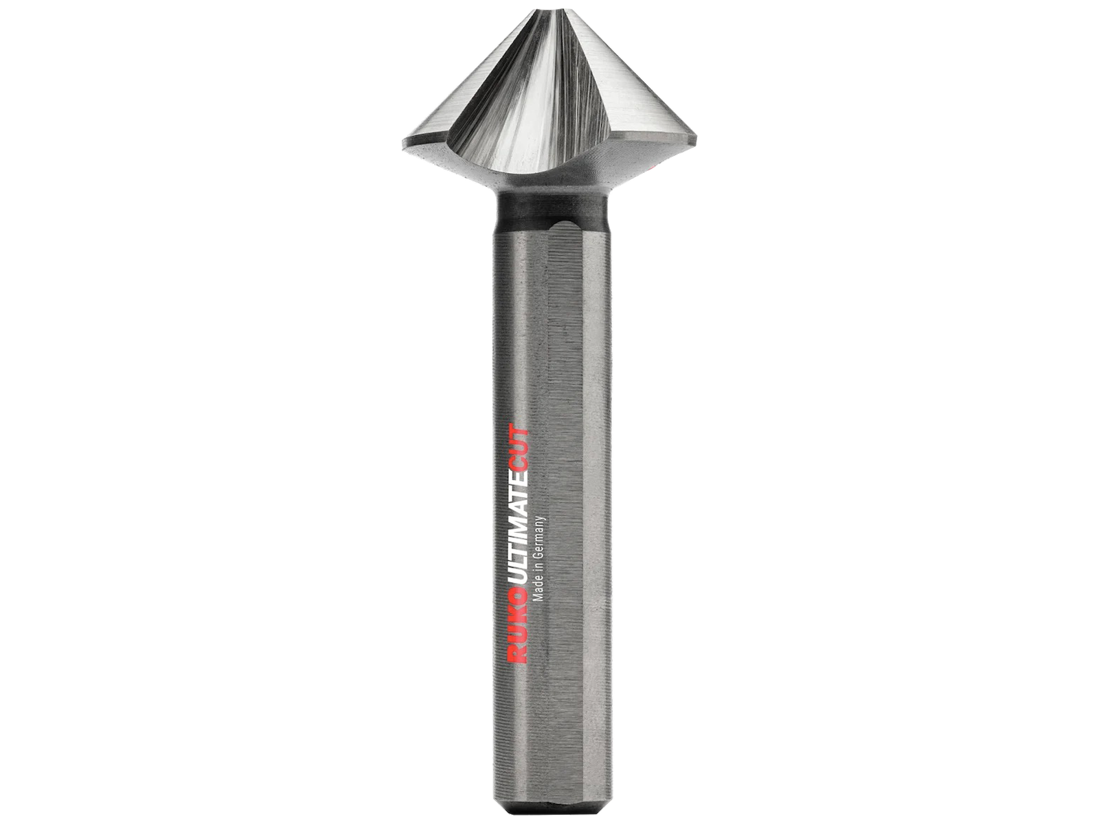 UltimateCut spidsforsænker DIN 335 type C, 90° med 3 skær og skaft med tre spændeflader. Fremstillet af HSS-Co5 velegnet til rustfrit stål, stål op til 1.100 N/mm², aluminium, messing og plast. Fås i flere dimensioner.