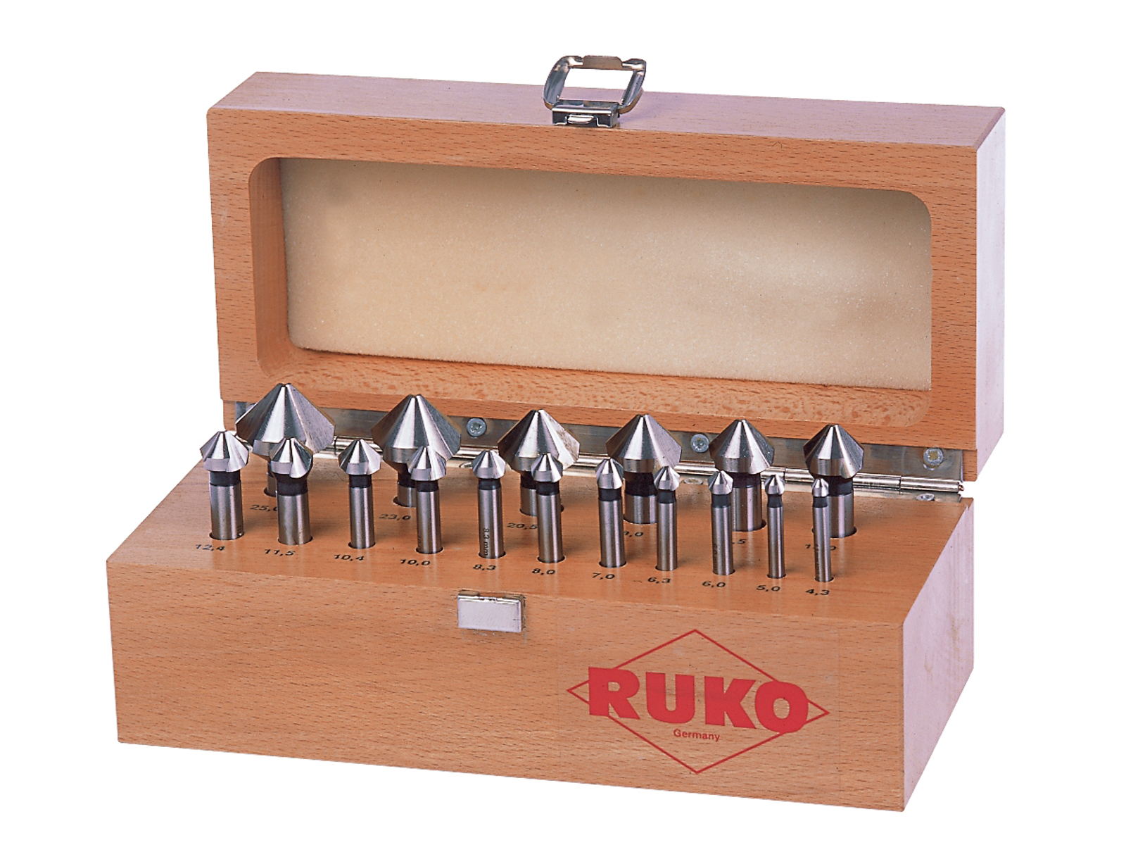 Spidsforsænkersæt med 17 dele i trææske. Koniske og afgratende undersænkere DIN 335 type C. Indeholder: ø4,3 - 5,0 - 6,0 - 6,3 - 7,0 - 8,0 - 8,3 - 10,0 - 10, 4 - 11,5 - 12,4 -15,0 - 16,5 - 19,0 - 20,5 - 23,0 - 25,0 mm (ø16,5 mm = skaft ø10,0 mm).