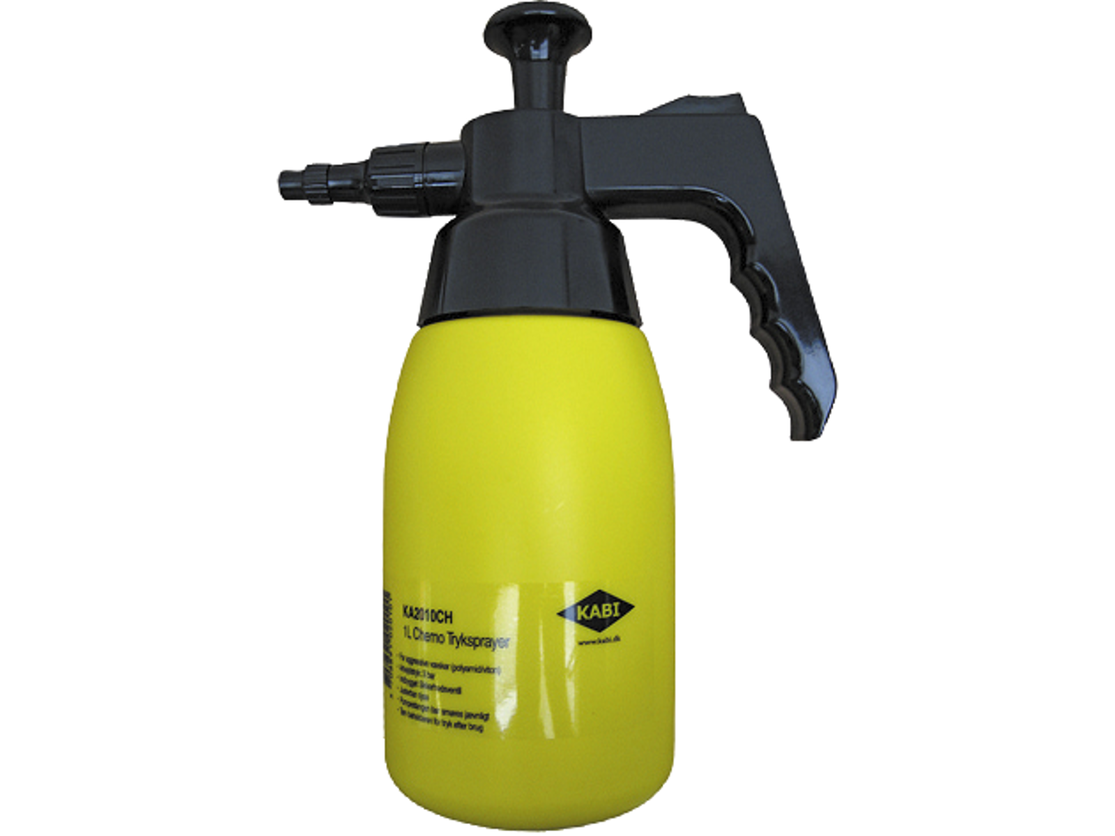 KABI Chemo tryk-sprayer 1,0 ltr. Velegnet til forstøvning af aggressive væsker, dog ikke sprit- og acetoneholdige produkter. Specielt velegnet til oliebaserede væsker. Man skal dog altid sikre sig at sprayeren ikke beskadiges af det anvendte produkt. Er forsynet med justerbar dyse. Pumpe af polyamid. Pakning af Viton. Arbejdstryk 3 bar. Indhold 1,0 liter.