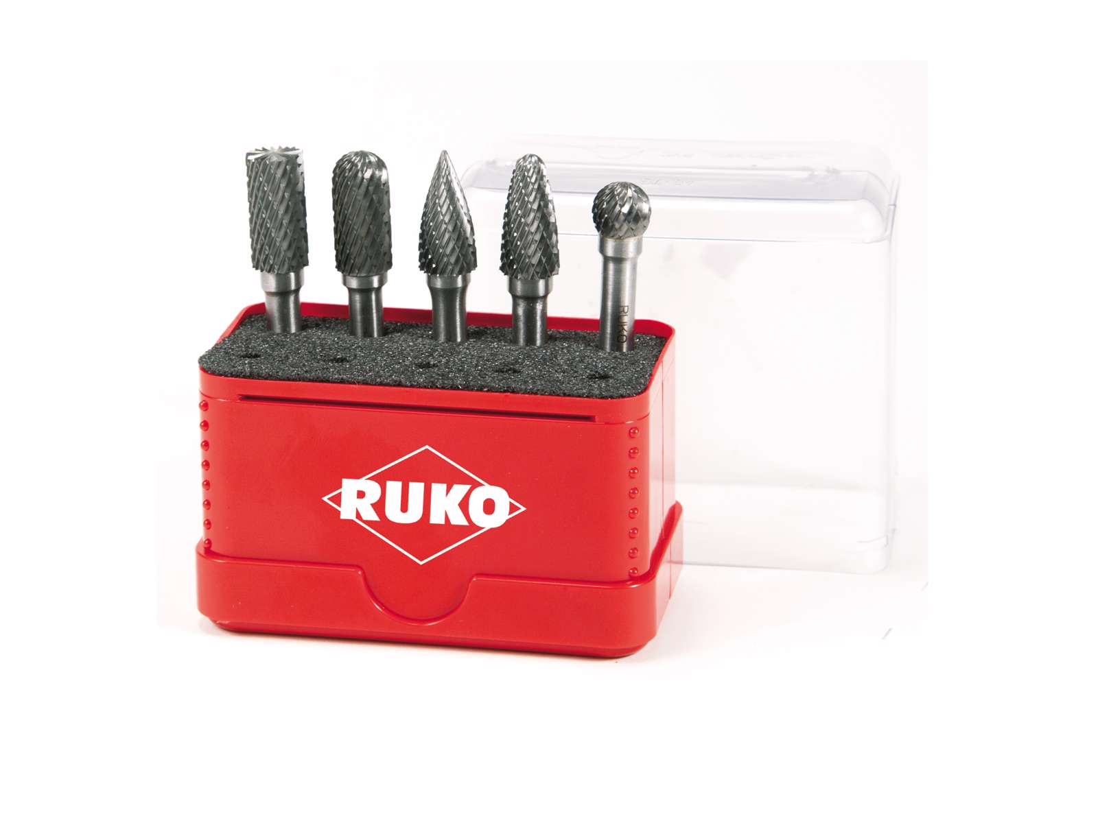 Sæt med 5 stk hårdmetal fræsestifter i mini-plastikboks. Indhold 1 stk af hver i Ø 10 mm, form A cylindrisk med endeskær (ZYA), form C med afrundet top (WRC), form G med spids (SPG), form F med afrundet top (RBF), form D med kugle (KUD).