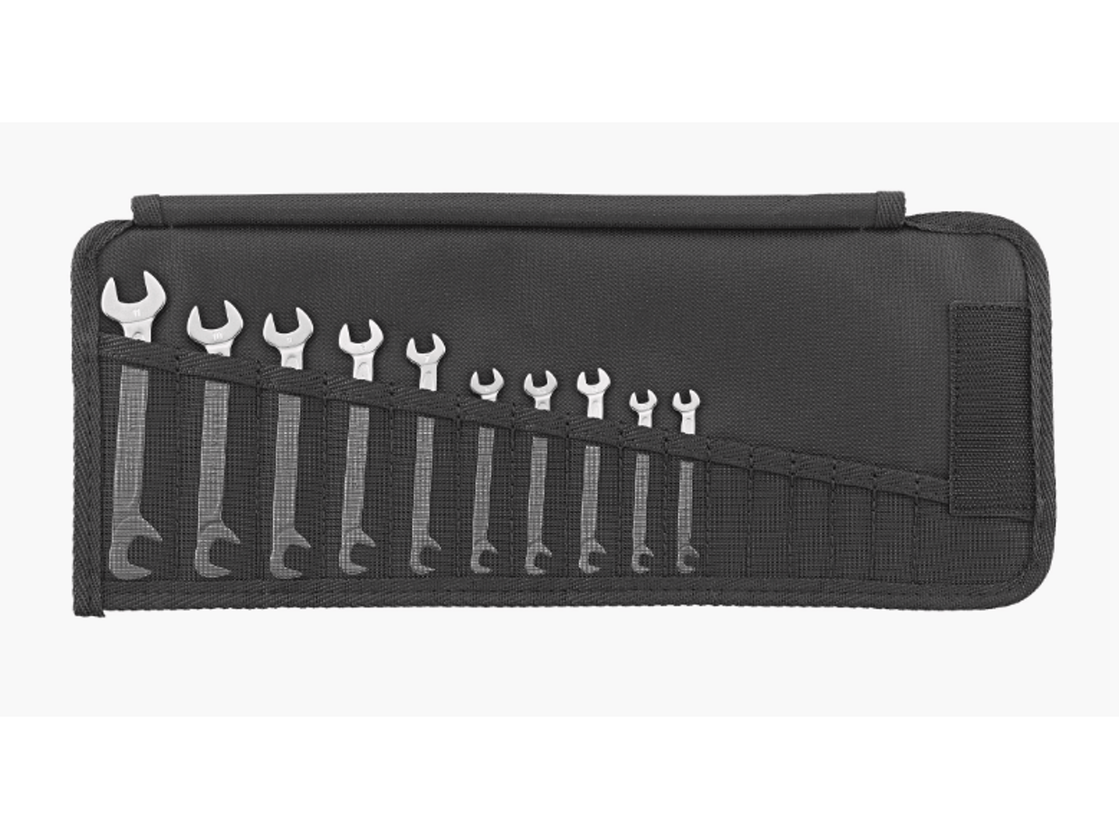 Skruenøglesæt i 10 dele i praktisk rulletaske med velcro i ekstremt slidstærkt tekstilmateriale