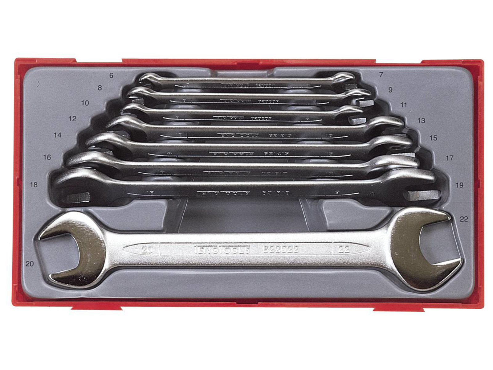 Sæt med 8 dobbelte, faste skruenøgler. Af kromvanadiumstål. Polerede hoveder.
